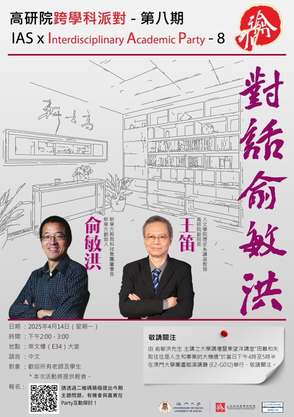 澳門大學人文社科高等研究院(高研院)現誠邀您參與“高研院跨學科派對 – 8”。該活動每期邀請不同學者就特定主題發表非正式的演講或對話,並提前向參與者徵集問題再轉交主講嘉賓,用於討論環節中與嘉賓互動探討,增強校內師生跨學科研究活動及師生間的聯繫,激發創新思維和學術探索。詳情請參閱如下: