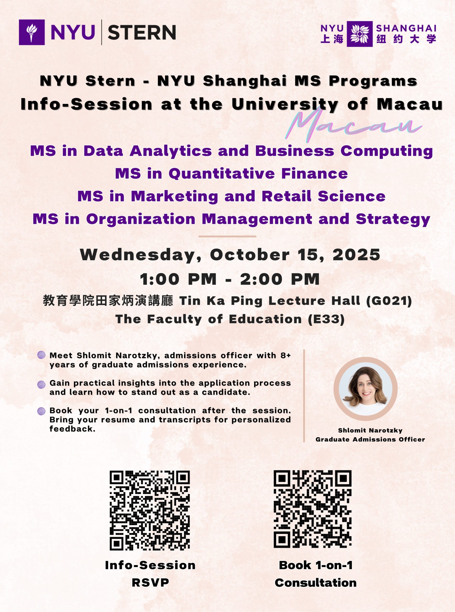 簡介會內容: | 院校代表將介紹由紐約大學斯特恩商學院 (NYU Stern) 和上海紐約大學聯合開設的商科理學碩士項目,包括數據分析和商業計算、計量金融、營銷與零售科學、以及組織管理與戰略。這些課程旨在培養目標在中國及亞洲地區開創職業生涯的未來商業精英。此外,歡迎同學登入以下連結,與院校代表預約進行線下一對一諮詢。 |