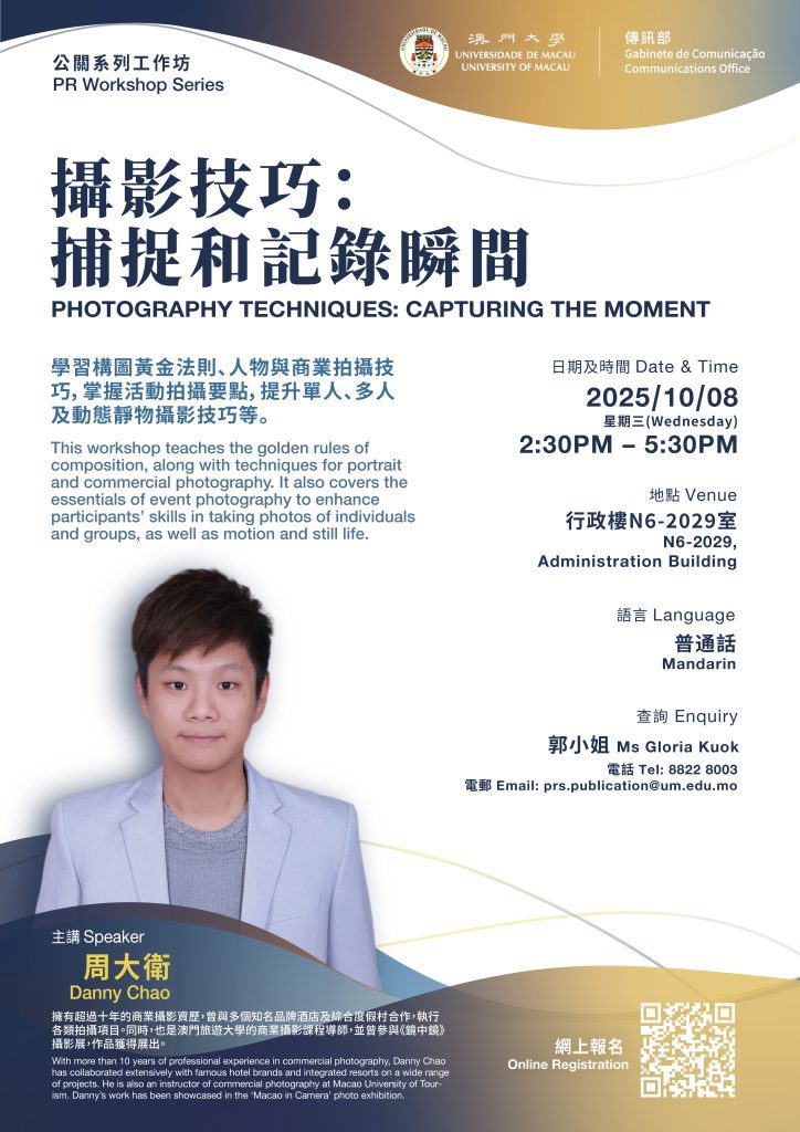 The Communications Office will hold CO PR Workshop Series: Photography techniques: Capturing the moment on 8 Oct 2025. We welcome all UM members to join.