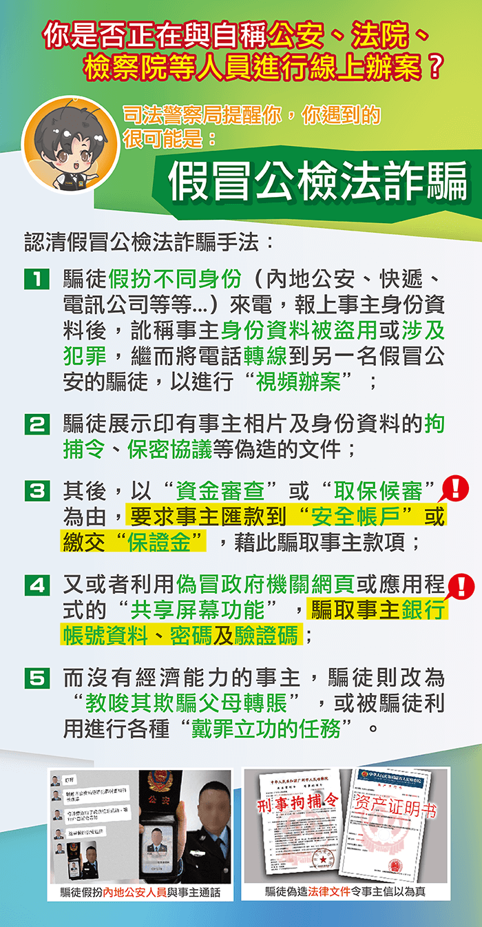 鑑於本澳詐騙個案持續受到關注,人力資源處 (HRS) 將定期與各位分享各類防詐騙資訊,旨在提高大家的警覺性、增強應對能力,並協助各位同仁保持戒備,提醒身邊師生及親友增強防騙意識,共同守護彼此的安全。