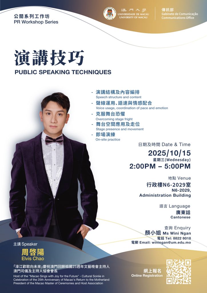 The Communications Office will hold CO PR Workshop Series: Public Speaking Techniques on 15 October 2025. We welcome all UM members to join.