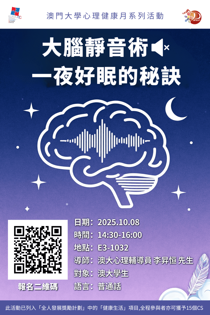 【講座報名】澳大心理健康月系列活動:大腦靜音術:一夜好眠的秘訣 (2025.10.08)