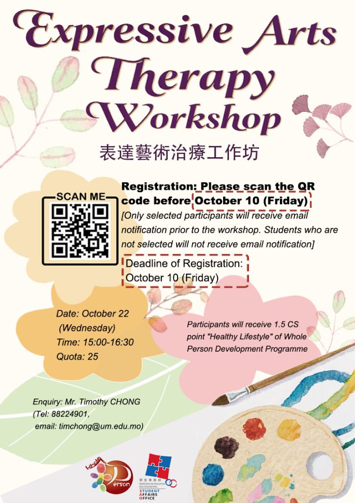 Overview: This Expressive Arts Therapy Workshop offers a unique opportunity for university students to explore self-expression and emotional well-being through various creative arts modalities. No prior artistic experience is required—just an open mind and willingness to engage. Participants will learn how creative processes like drawing, movement, and sound can help reduce stress, enhance self-awareness, and support mental wellness. The workshop also provides a supportive space to connect with peers and reflect in a non-judgmental atmosphere. Eligible attendees will receive 1.5 “Healthy Lifestyle” CS points under the Whole Person Development Programme. Don’t miss this chance to unwind, create, and grow!