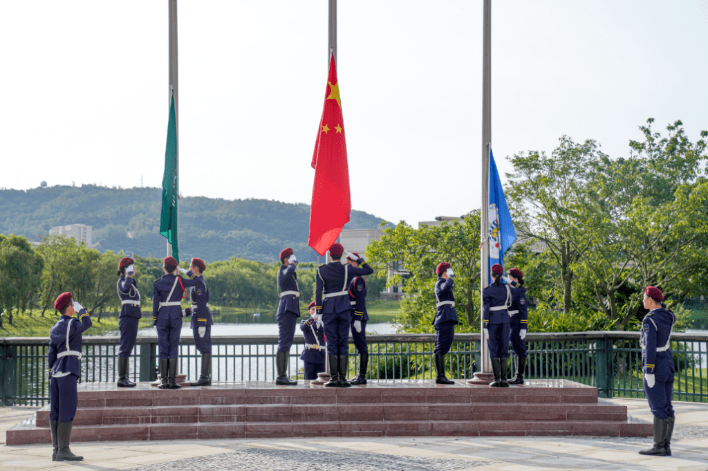 In celebration of the 76th anniversary of the founding of the People’s Republic of China, the National Flag Team of the University of Macau (UM) held a flag-raising ceremony at UM Lotus Square today (1 October). In the presence of UM students and faculty, members of the National Flag Team escorted the national flag of China, the regional flag of the Macao SAR, and the UM flag, and marched to the flagpole near the Wall of Great Wisdom. As the national anthem played, the three flags were raised. Around 500 UM members attended the ceremony.