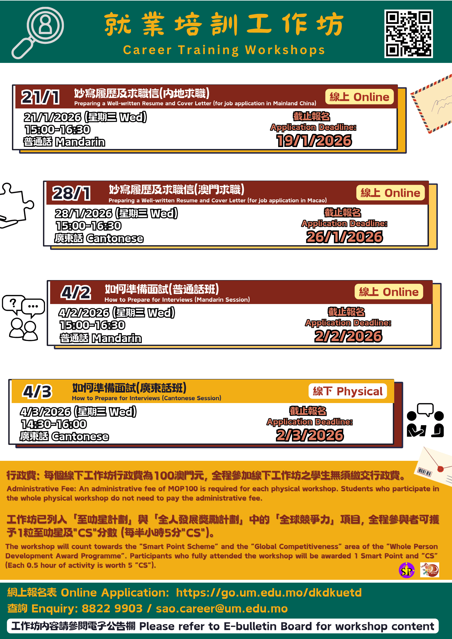 For example: If you have registered for “How to Prepare for Interviews (Cantonese Session)”, you need to fully attend the physical workshop on 4 Feb, 2:30-4:00pm. An administrative fee of MOP100 is required for each physical workshop. If you have registered for the physical workshop, but absent for the whole or part of the physical workshop, you will need to pay the administrative fee of MOP100.