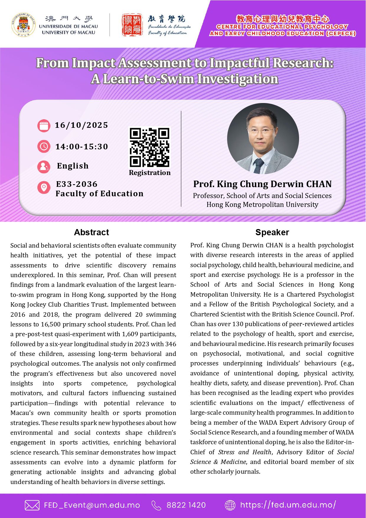 教育學院—教育心理與幼兒教育中心講座:“成效評估能否具轉化成為具影響力的研究?一個關於游泳研究的分享”