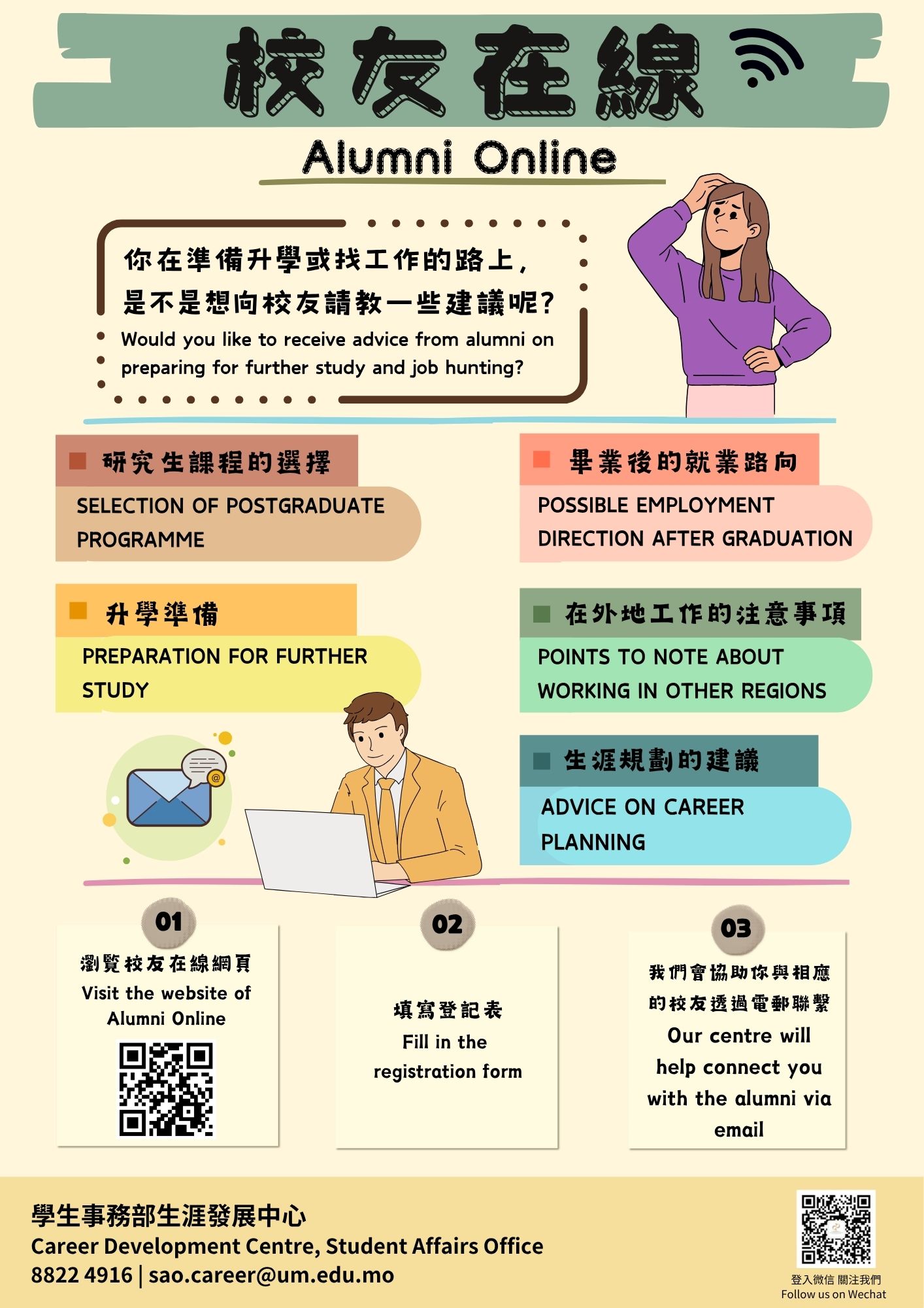 【Advising Service】Connect with alumni for career and further study advice through “Alumni Online” !