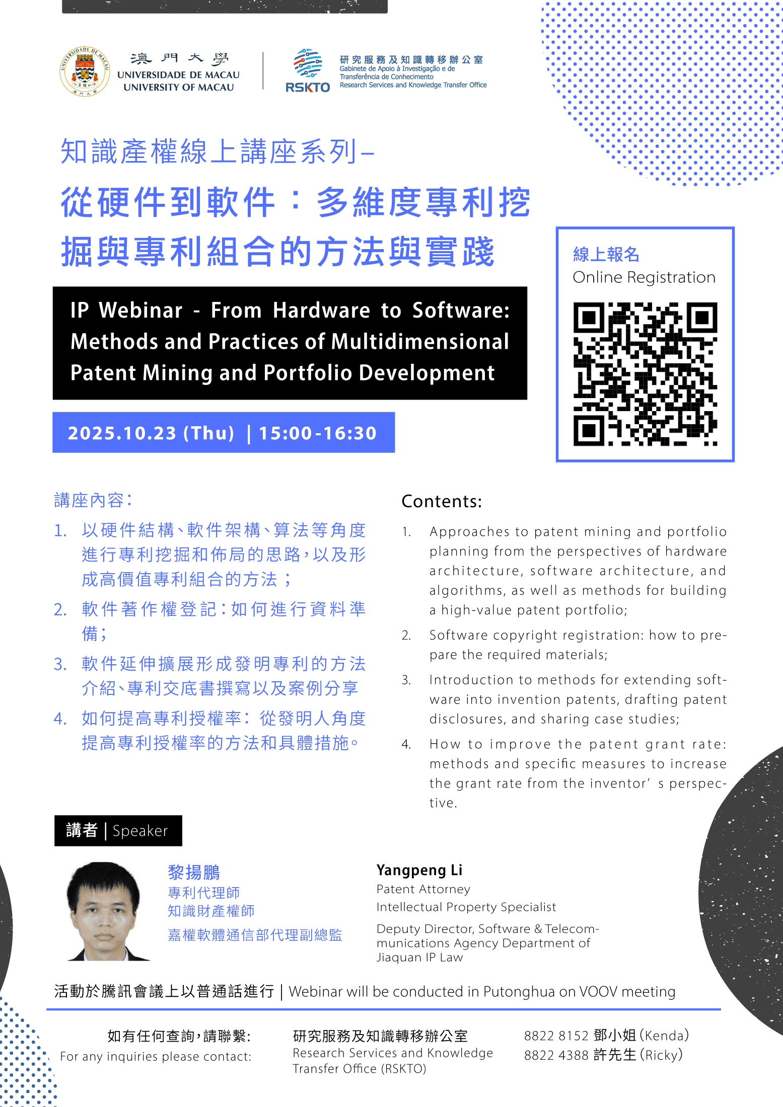 知識產權線上講座系列 : 1. 從硬件到軟件:多維度專利挖掘與專利組合的方法與實踐; 2. 醫藥領域實審最新動態分析以及對專利佈局的啓示