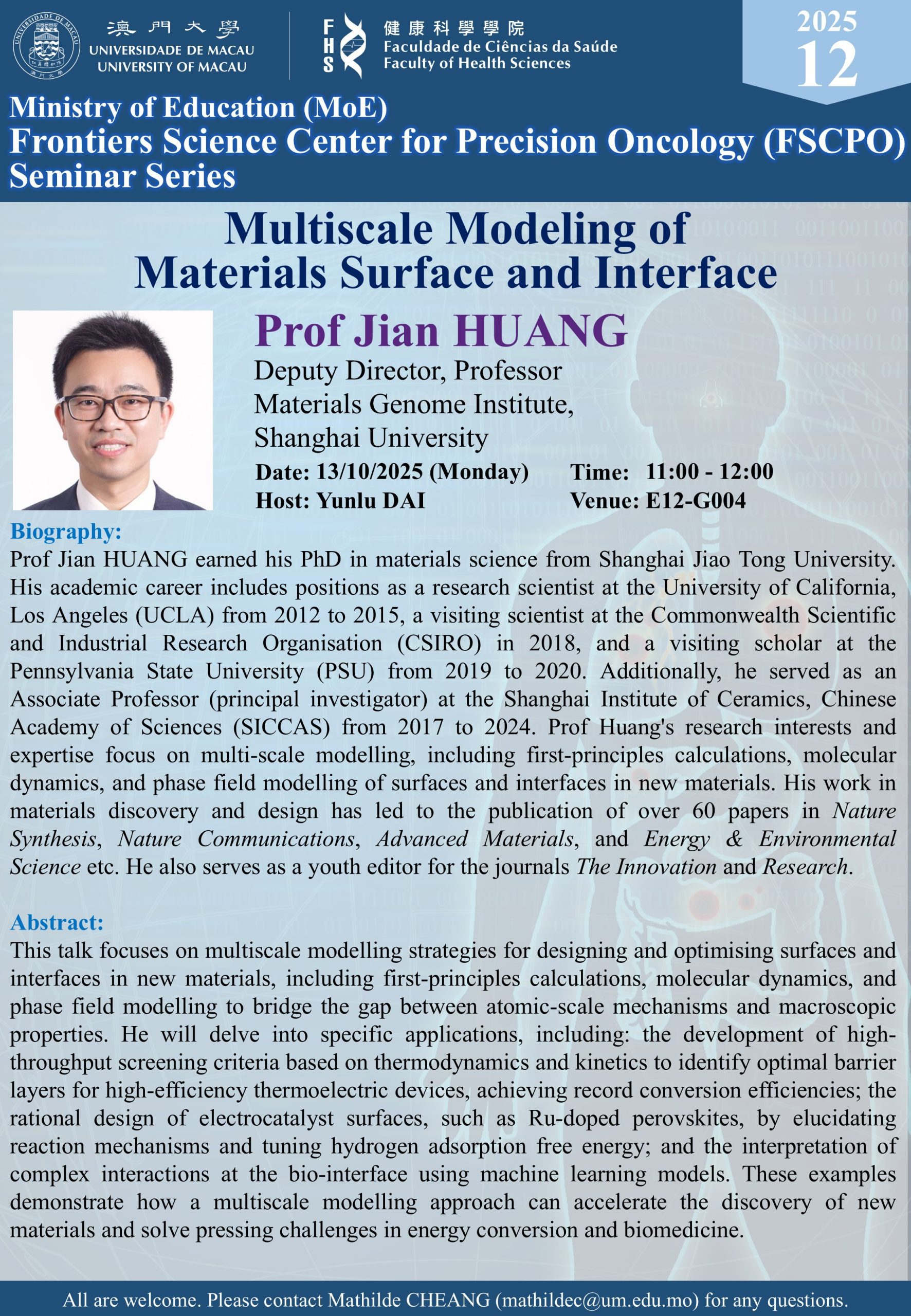 [Upcoming Activity] Seminar Series of Ministry of Education Frontiers Science Center for Precision Oncology, University of Macau – Multiscale Modeling of Materials Surface and Interface by Prof Jian HUANG