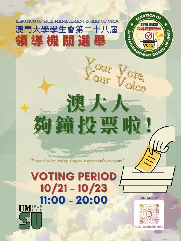 The election committee hereby appeal to the students of the University of Macau to seize the opportunity to exercise their rights as members of the Students’ Union and cast a sacred vote for the operation of the management board of the Student Union in the coming year. Your vote is important, let’s build a better campus future.