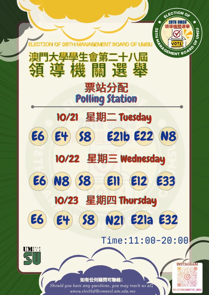 選舉委員會(以下簡稱「選委會」)根據澳門大學學生會第 2/2025 號內部規章《領導機關選舉制度》第四十四條的規定訂定投票站的地點由選委會訂定,並最遲於投票日前十日公佈。選委會現公布本屆選舉票站位置,本屆選舉共設有十二個票站,位置如下: