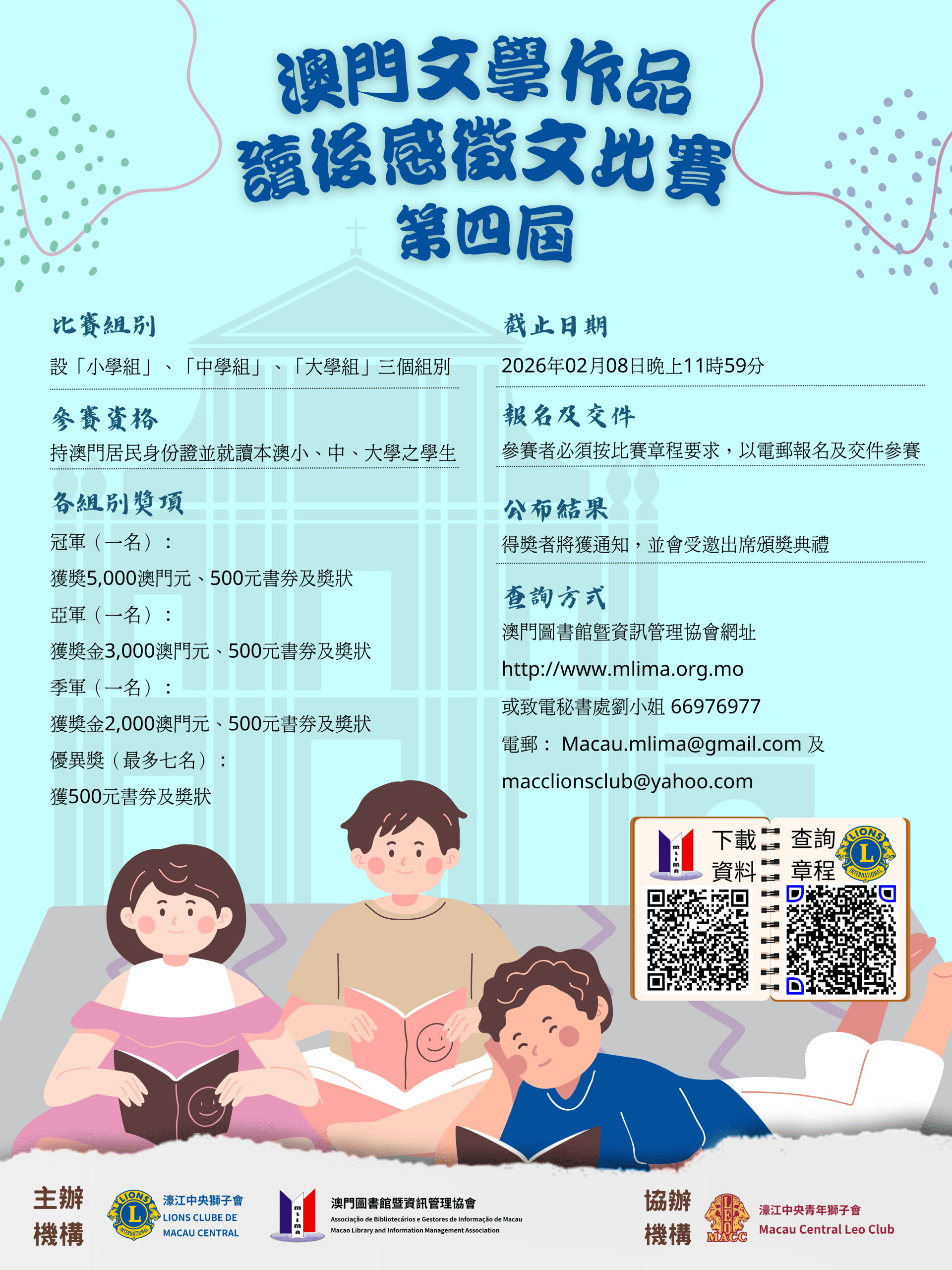 為推動本澳閱讀風氣,鼓勵本澳青少年加深對澳門文學作品的認識及多了解澳門,濠江中央獅子會及澳門圖書館暨資訊管理協會聯合主辦 “第四屆澳門文學作品讀後感徵文比賽”。歡迎所有同學參與。