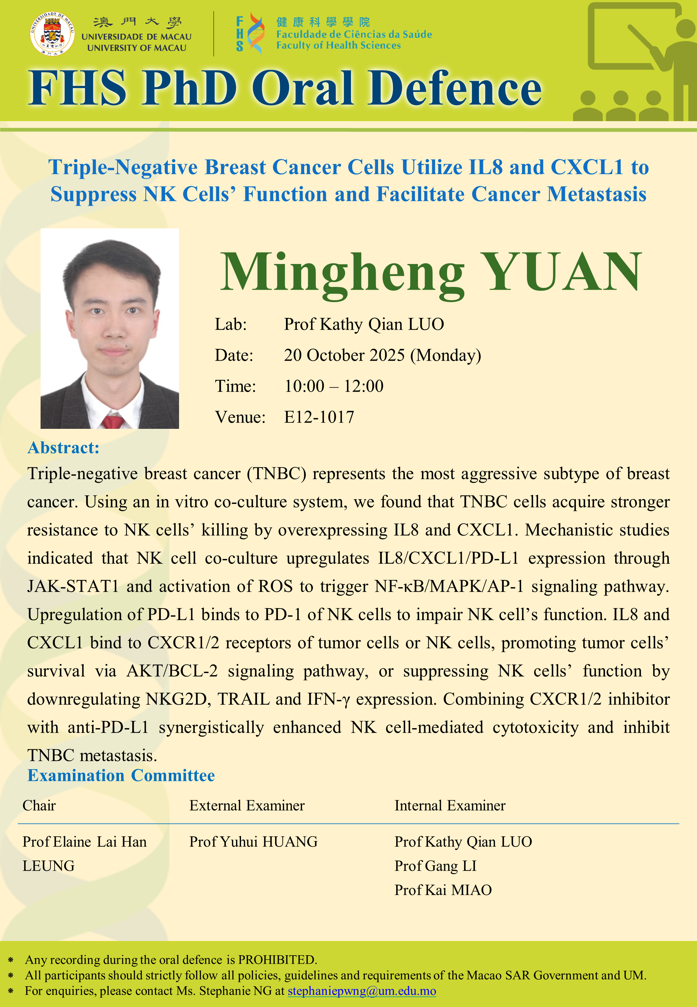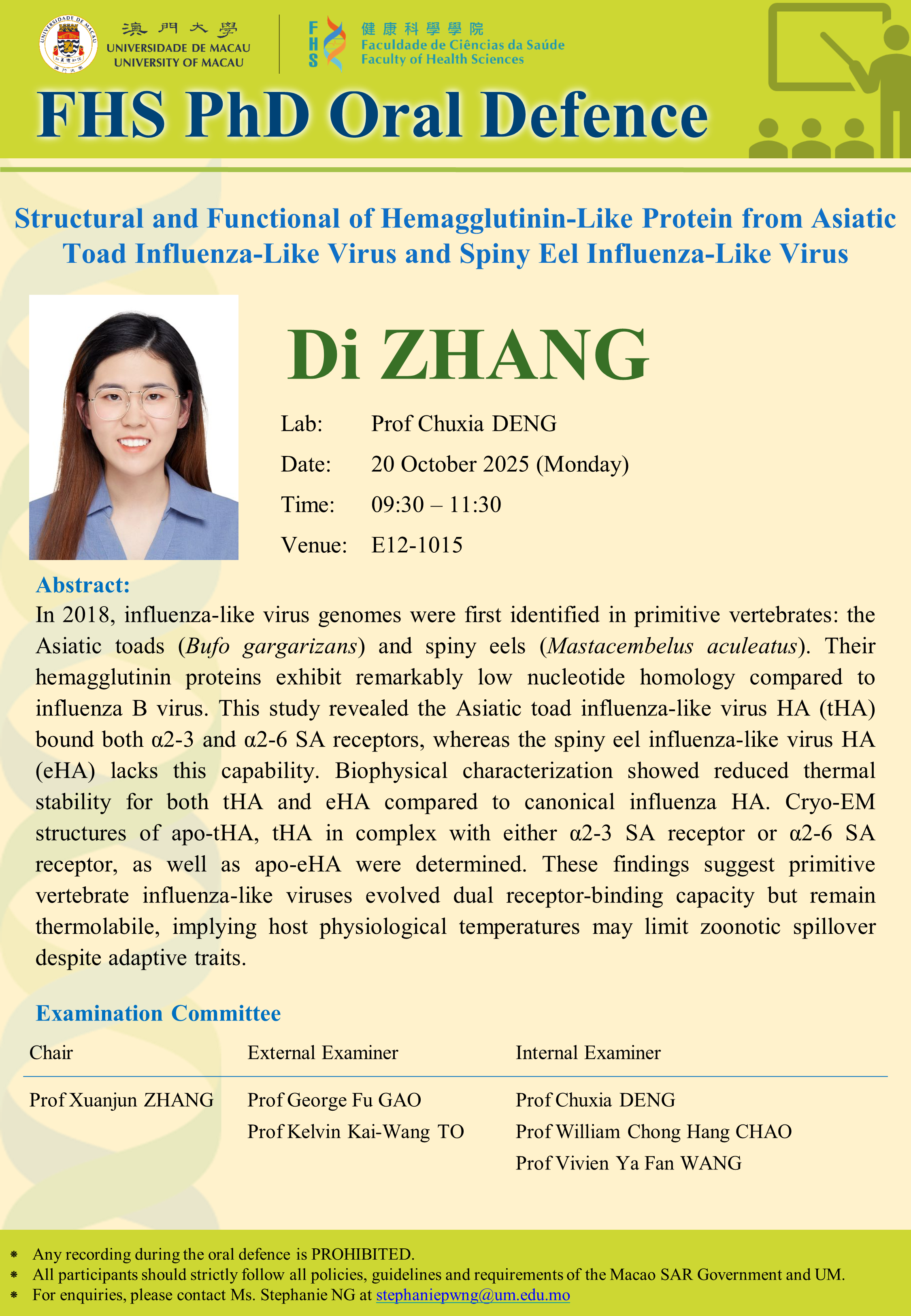 PhD Oral Defence in Faculty of Health Sciences, by Ms Di ZHANG, Mr Mingheng YUAN and Mr Yiling HU on 20 October 2025 (Monday)