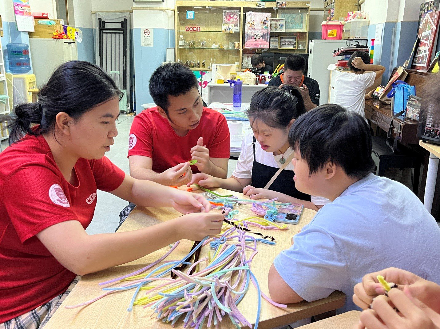 活動開始前,義工們帶領唐寶寶們進行舞蹈熱身,現場氣氛輕鬆活潑。隨後,義工們分組指導唐寶寶們進行扭扭棒創作,從顏色搭配到部件組裝,耐心講解每個步驟,並細心提醒安全注意事項。在義工的協助下,唐寶寶們發揮創意,完成了小櫻桃掛件、蝴蝶戒指、棒棒糖等多樣作品。