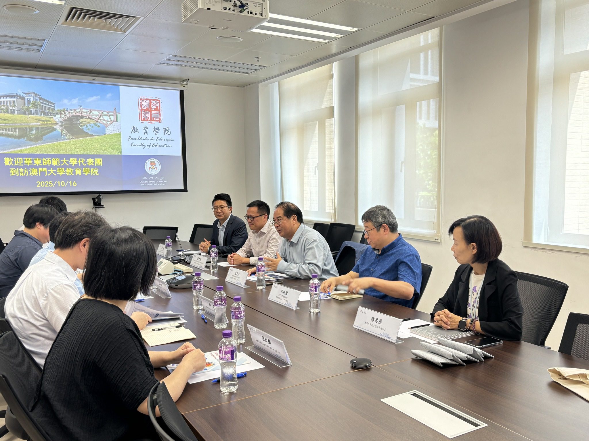 On October 16, 2025, a delegation from the School of Mathematical Sciences of East China Normal University (ECNU) visited the Faculty of Education (FED) of the University of Macau (UM) to strengthen academic exchange and explore potential collaboration between two institutions. The ECNU delegation was led by Prof. Changhong LV, Assistant to the President of ECNU and Dean of the School of Mathematical Sciences; Prof. Pan JIA, Deputy Secretary of the Party Committee; Prof. Tao CHENG, Associate Dean; Prof. Delong LIN, Undergraduate Education Administrator; and Ms. Hongyan ZHANG, Office Director of the School of Mathematical Sciences.