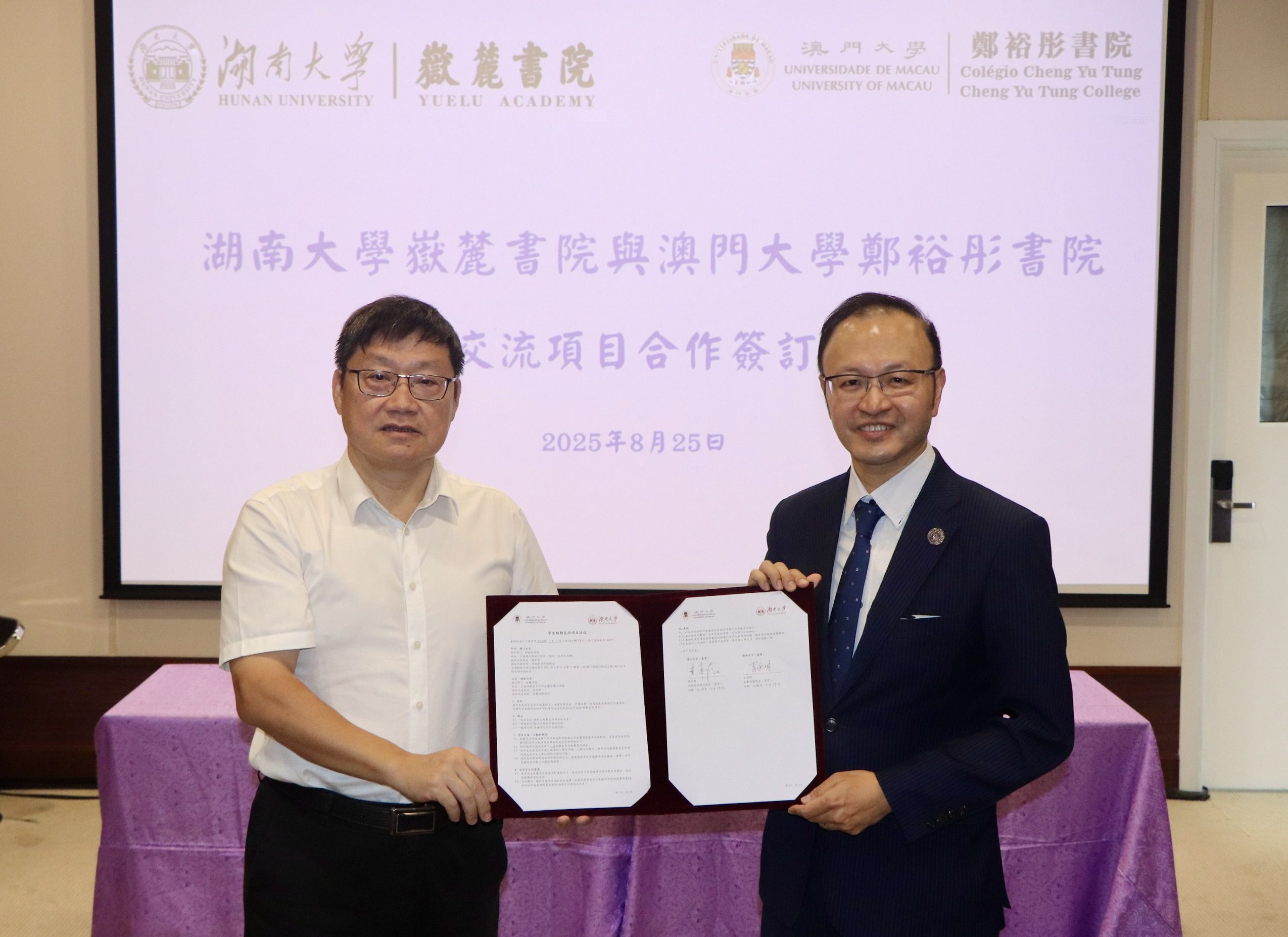 澳大鄭裕彤書院代院長黃承發與湖南大學嶽麓書院院長肖永明代表簽署協議。黃承發期望,透過互訪活動讓兩院學生相互啟發、共同成長,為推動書院的發展作出貢獻。肖永明表示,交流活動有助擴大學生的國際視野,促進文化交流,推動兩校書院發展,為學生的成長和未來發展打下良好的基礎。