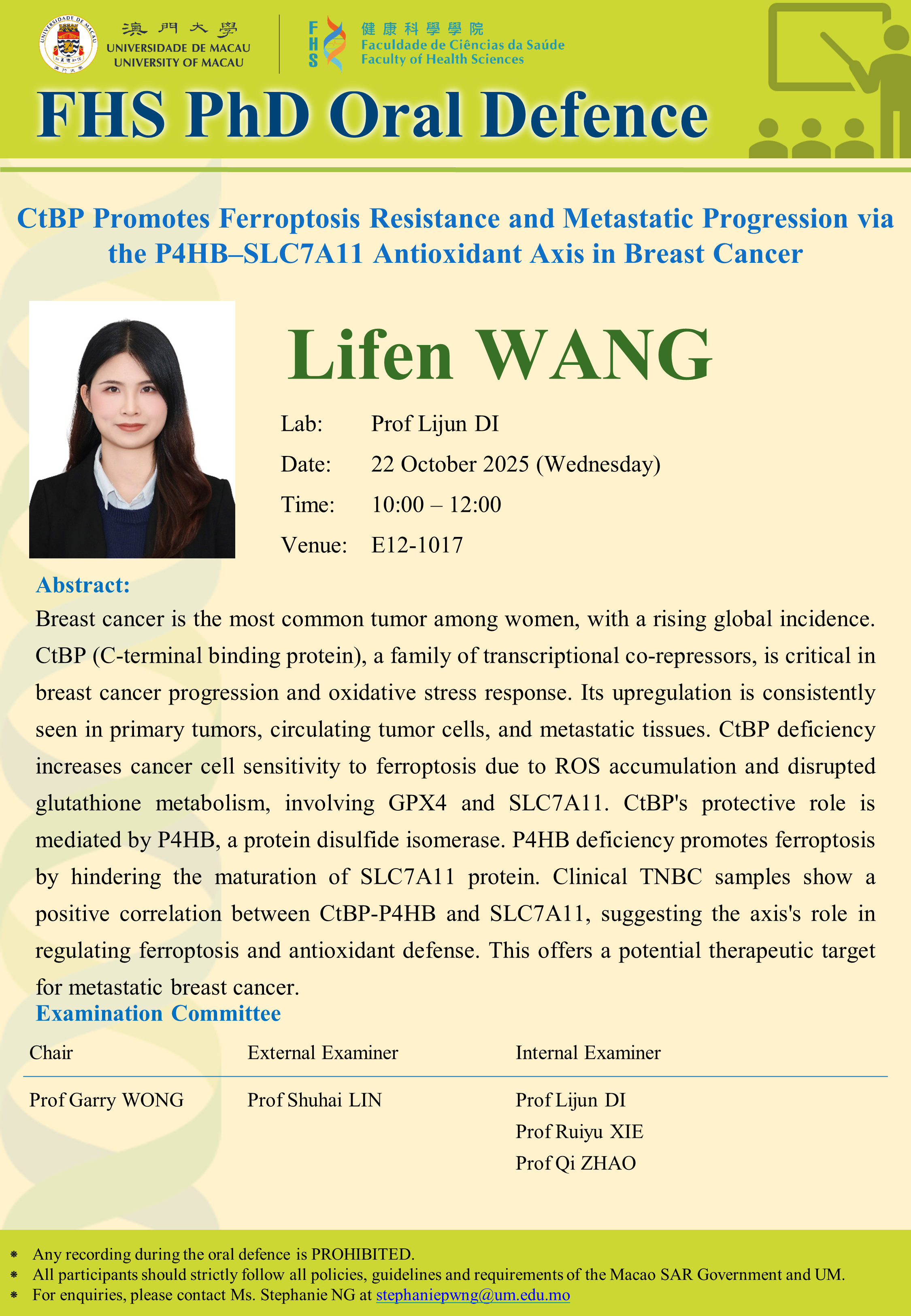 PhD Oral Defence in Faculty of Health Sciences, by Ms Lifen WANG on 22 October 2025 (Wednesday)
