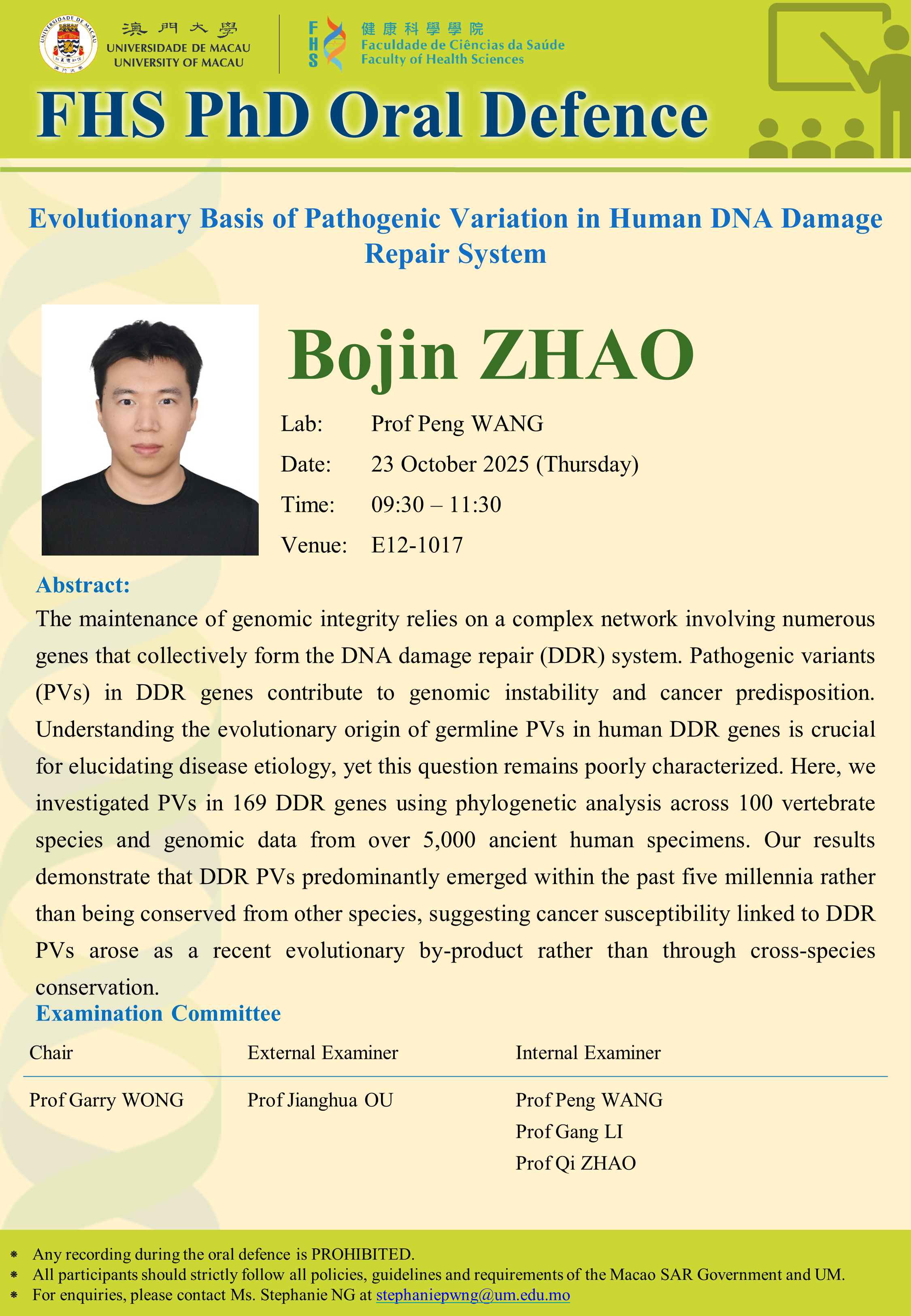 PhD Oral Defence in Faculty of Health Sciences, by Mr Bojin ZHAO on 23 October 2025 (Thursay)