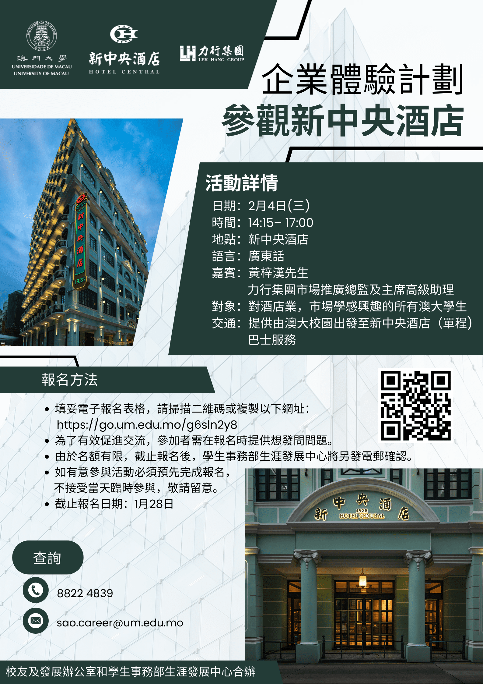 為了提供更了解行業發展、工作環境和市場趨勢的機會,學生事務部生涯發展中心和校友及發展辦公室將於2月4日(星期三) 舉辦「企業體驗計劃」活動。是次活動我們將到訪新中央酒店,讓同學們更了解澳門酒店業的發展。