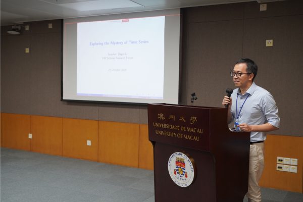 The University of Macau (UM) held the 28th UM Scholar Research Forum today (21 October), where Li Degui, Distinguished Professor and associate dean of the Faculty of Business Administration, delivered a talk titled ‘Exploring the Mystery of Time Series’. The talk was well attended, with many students and faculty participating in person and online.