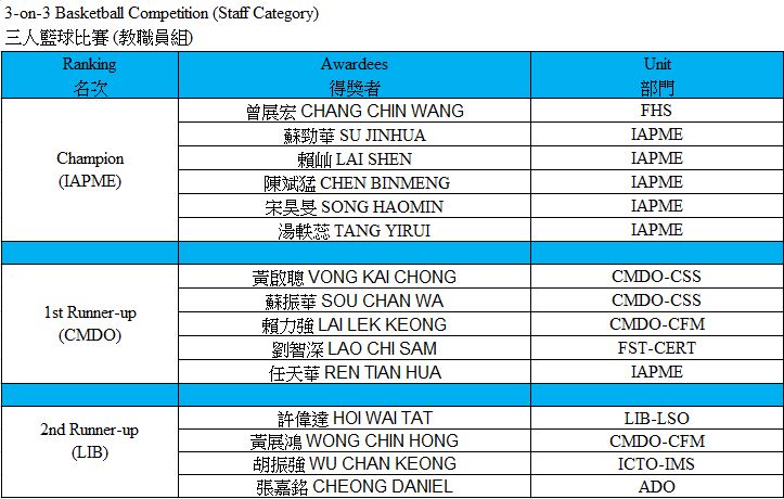 【澳大體育節】最新消息 (9): 籃球比賽 (教職員組,10月15日) 獲獎名單