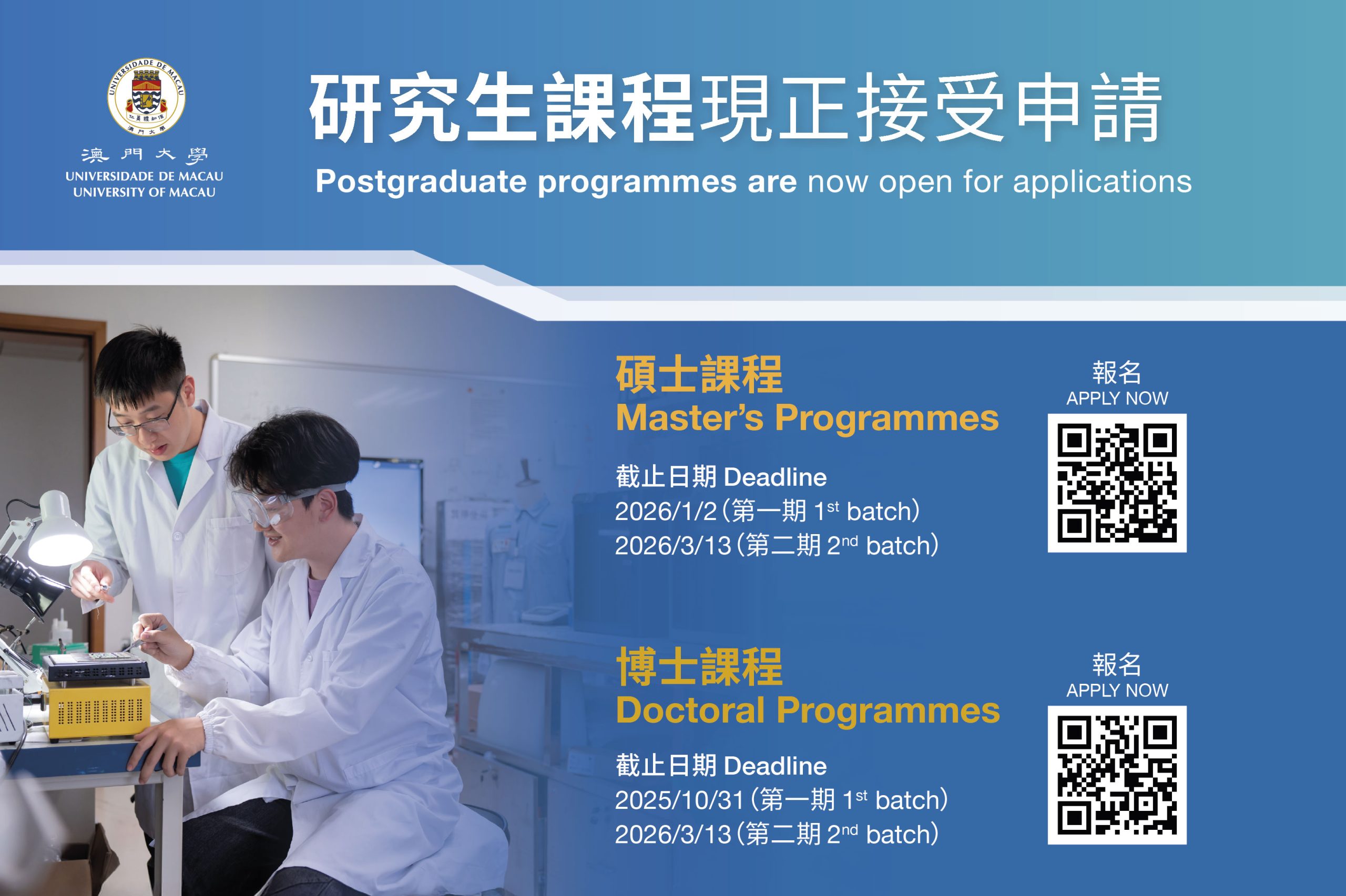 To support Macao’s economic diversification and align with industry needs, UM will introduce several new postgraduate programmes for the 2026/2027 academic year. The new programmes will cover fields such as smart power grid, artificial intelligence and education, and pharmaceutical sciences. In addition, with a commitment to nurturing high-calibre and well-rounded talent, UM offers a range of scholarships and financial aid for postgraduate students. These include the UM PhD Scholarship, the UM PhD Teaching Research Assistant, and the University of Macau Scholarship for Science, Technology, Engineering and Mathematics (STEM) Programmes.