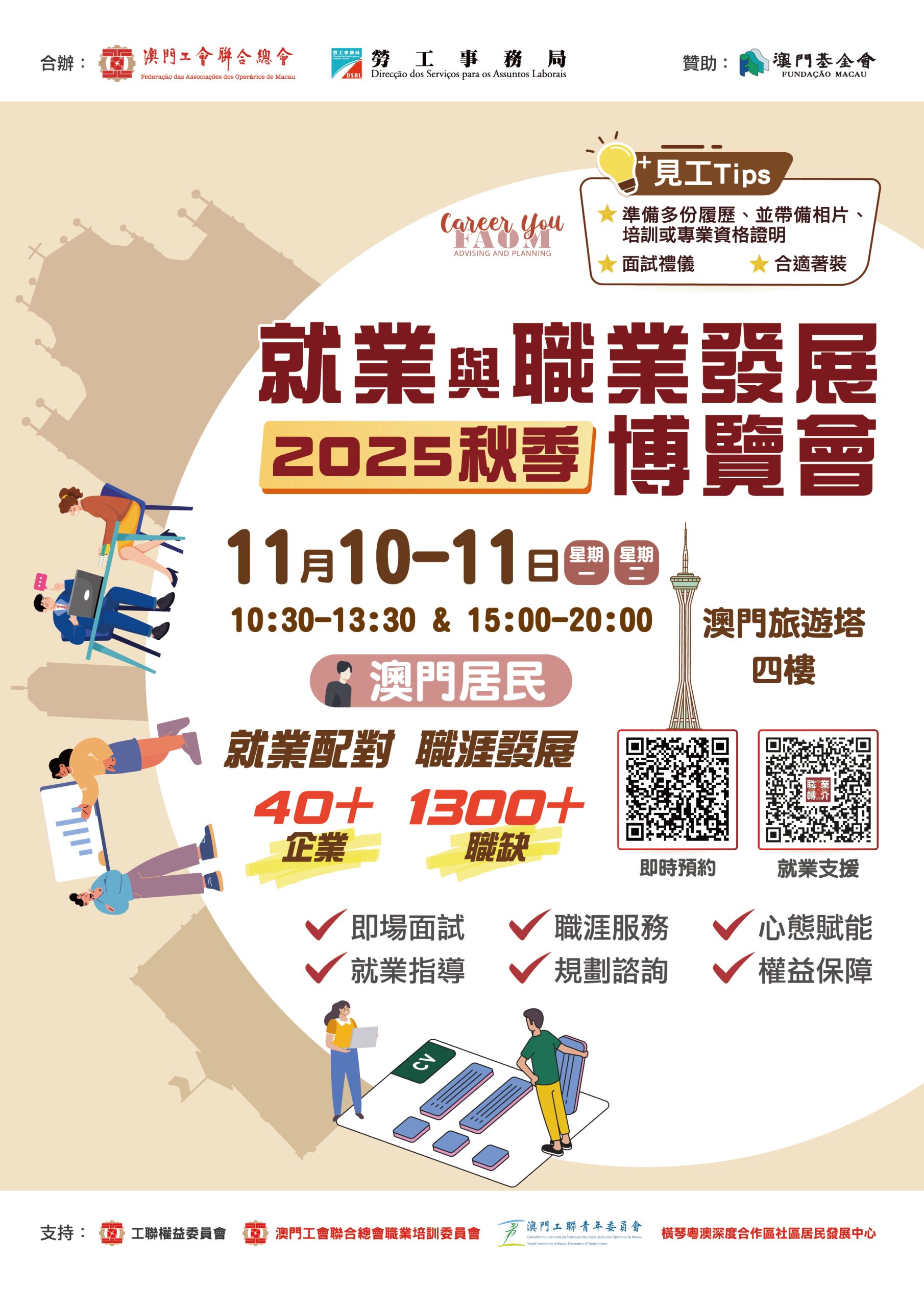 為進一步拓展居民就業空間,洞察產業趨勢,促進企業與人才的精準對接。澳門工會聯合總會與勞工事務局將於2025年11月10至11日假澳門旅遊塔舉辦「2025秋季就業與職業發展博覽會」及「職業發展系列活動」。以“就業渠道、職業交流、現場招聘及職涯服務”為主軸設計多項服務支援。助力求職者全面規劃職業路向,穩步開啓職業新階段。有關詳情,如下或見下圖。有興趣的同學,可透過圖中的二維碼報名。