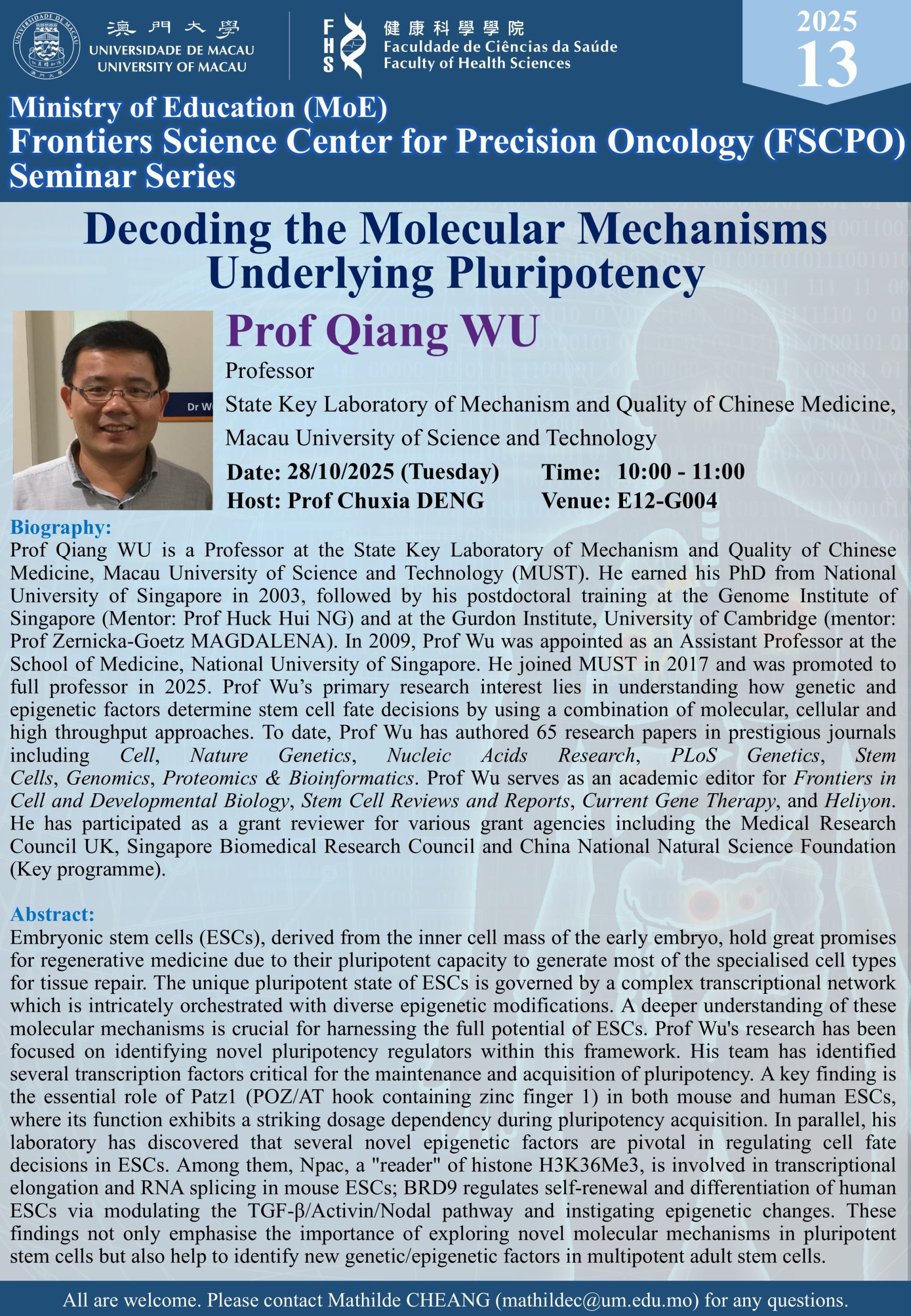 [Upcoming Activity] Seminar Series of Ministry of Education Frontiers Science Center for Precision Oncology, University of Macau – Decoding the Molecular Mechanisms Underlying Pluripotency by Prof Qiang WU