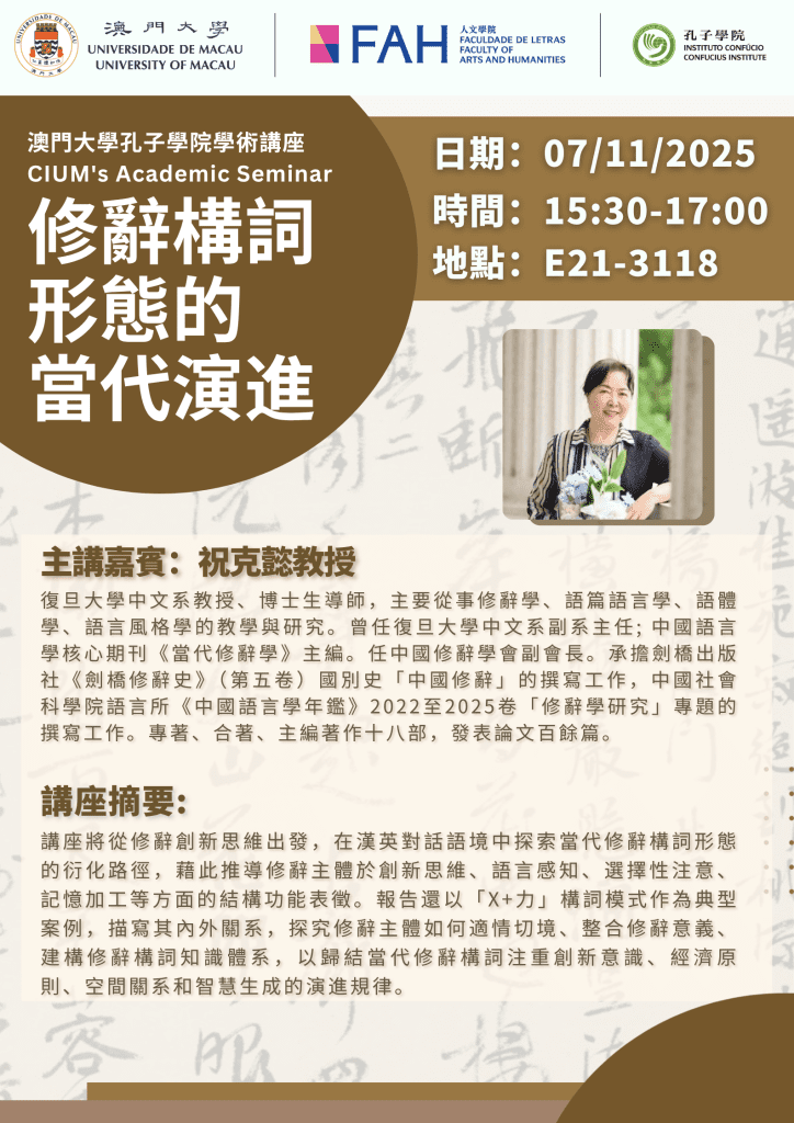 澳門大學孔子學院學術講座——修辭構詞形態的當代演進