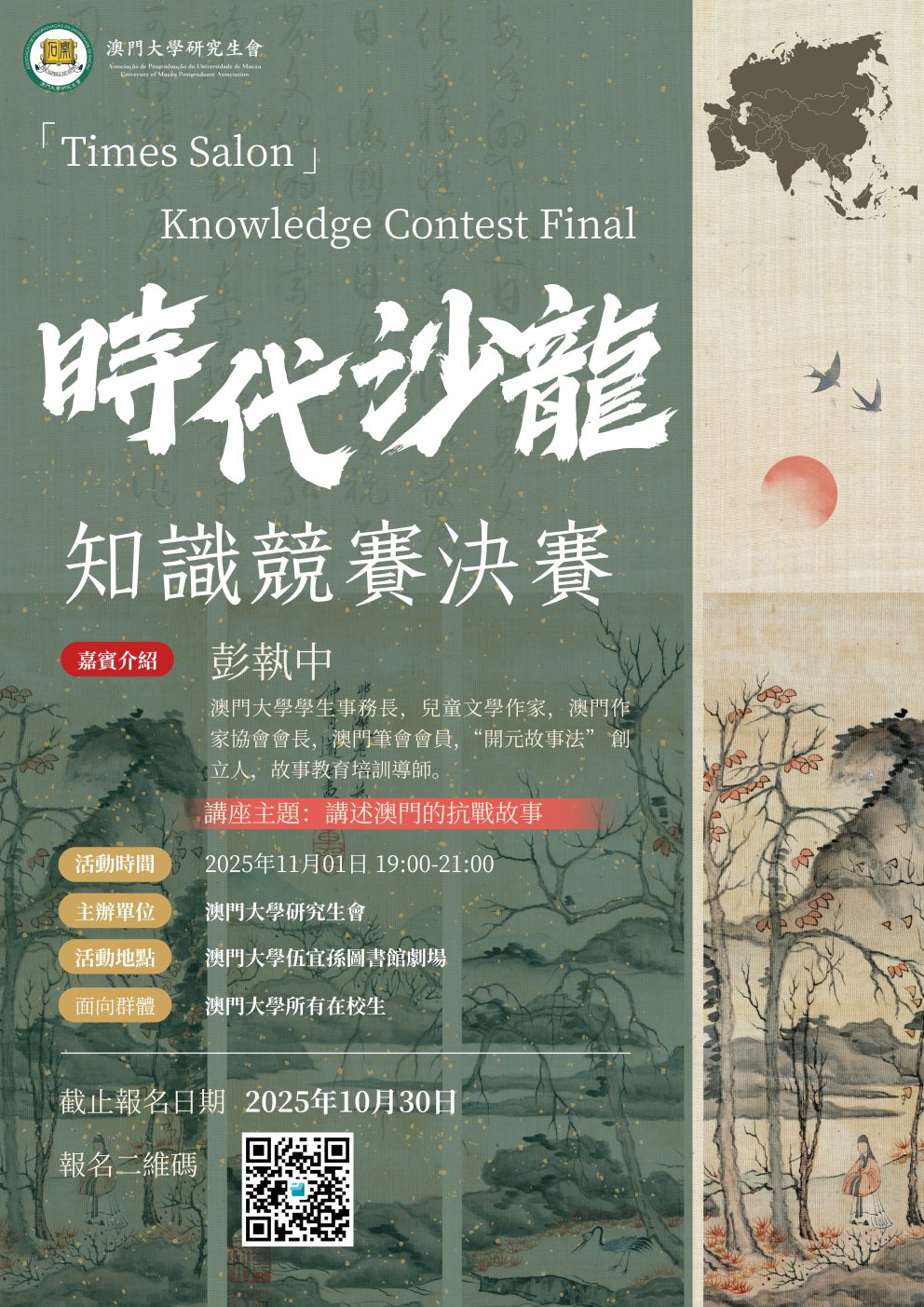 澳門大學研究生會:時代沙龍知識競賽決賽, 11月1日19:00-21:00, 圖書館E2 - 演講廳