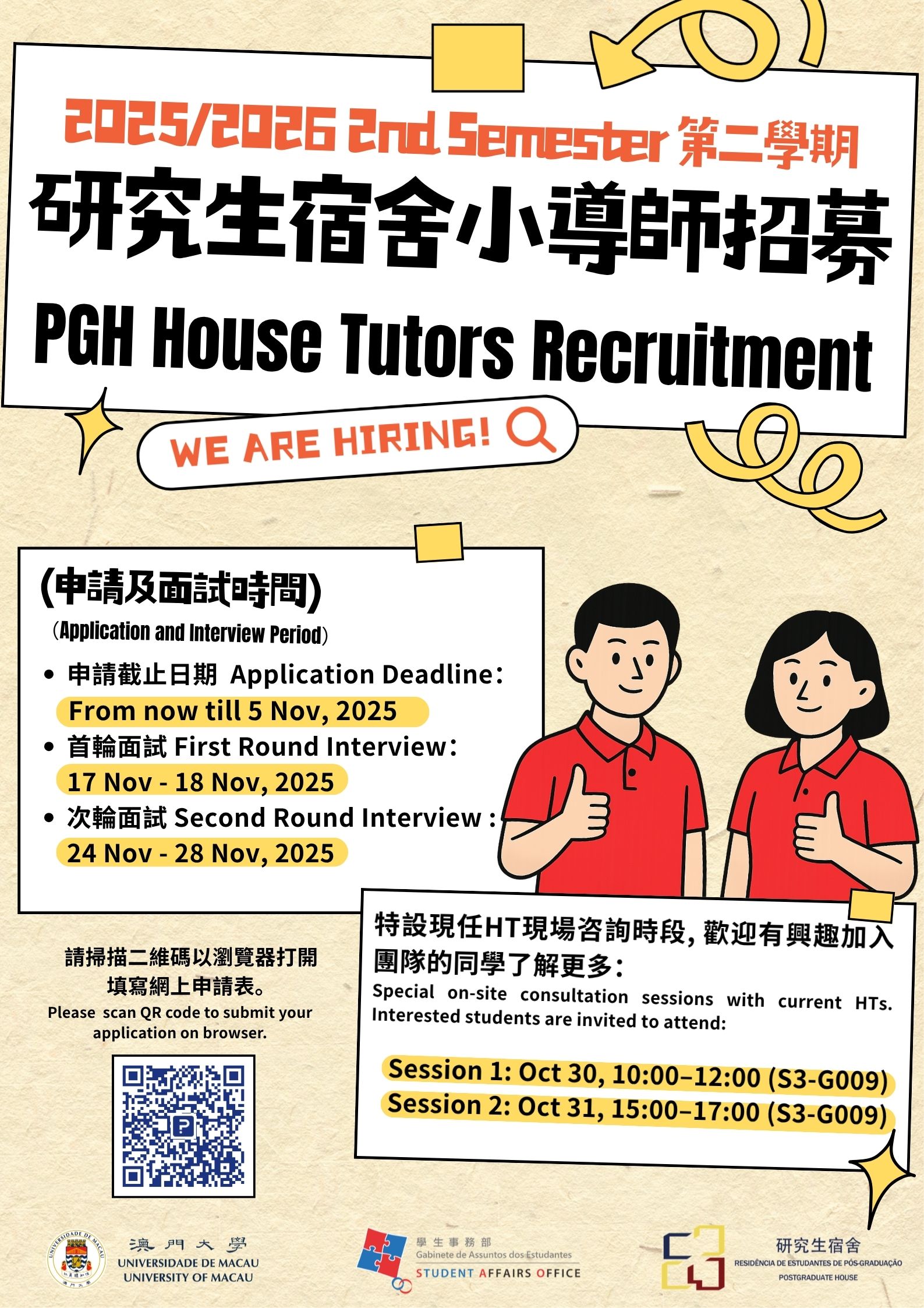 研究生宿舍小導師團隊正在招募2025/2026學年第二學期的新成員。請詳細閱讀招募指南(Recruitment Guidelines),並由即日起至11月5日23:59前提交網上申請。期待你的加入!