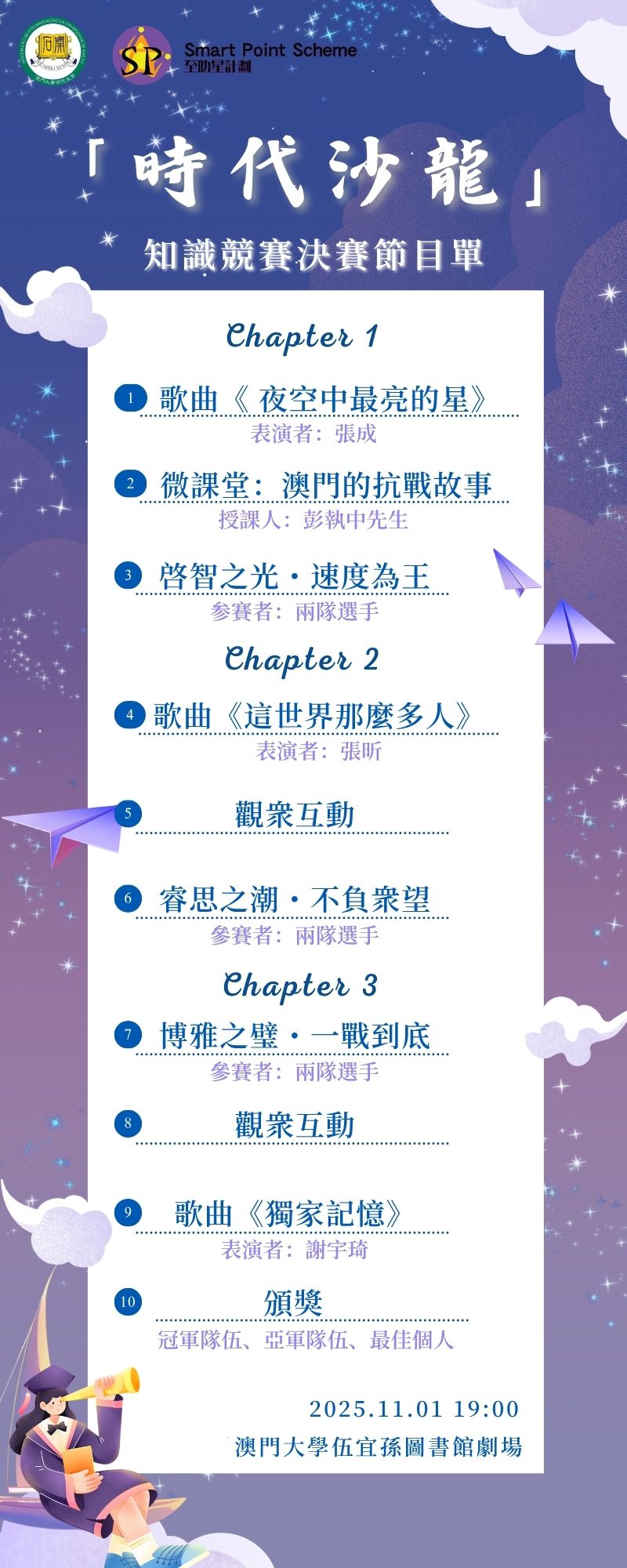 In addition to the competition, we are honored to invite Mr. PANG CHAP CHONG, Dean of Student, to share stories from Macau’s wartime history, guiding the audience through a chapter of the city’s past that time has nearly forgotten. This is not only a knowledge contest, but also a dialogue between youth and history — a moment to reflect, remember, and feel the enduring power of an era.
