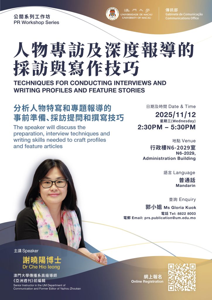 The Communications Office will hold CO PR Workshop Series: Techniques for conducting interviews and writing profiles and feature stories on 12 Nov 2025. We welcome all UM members to join.