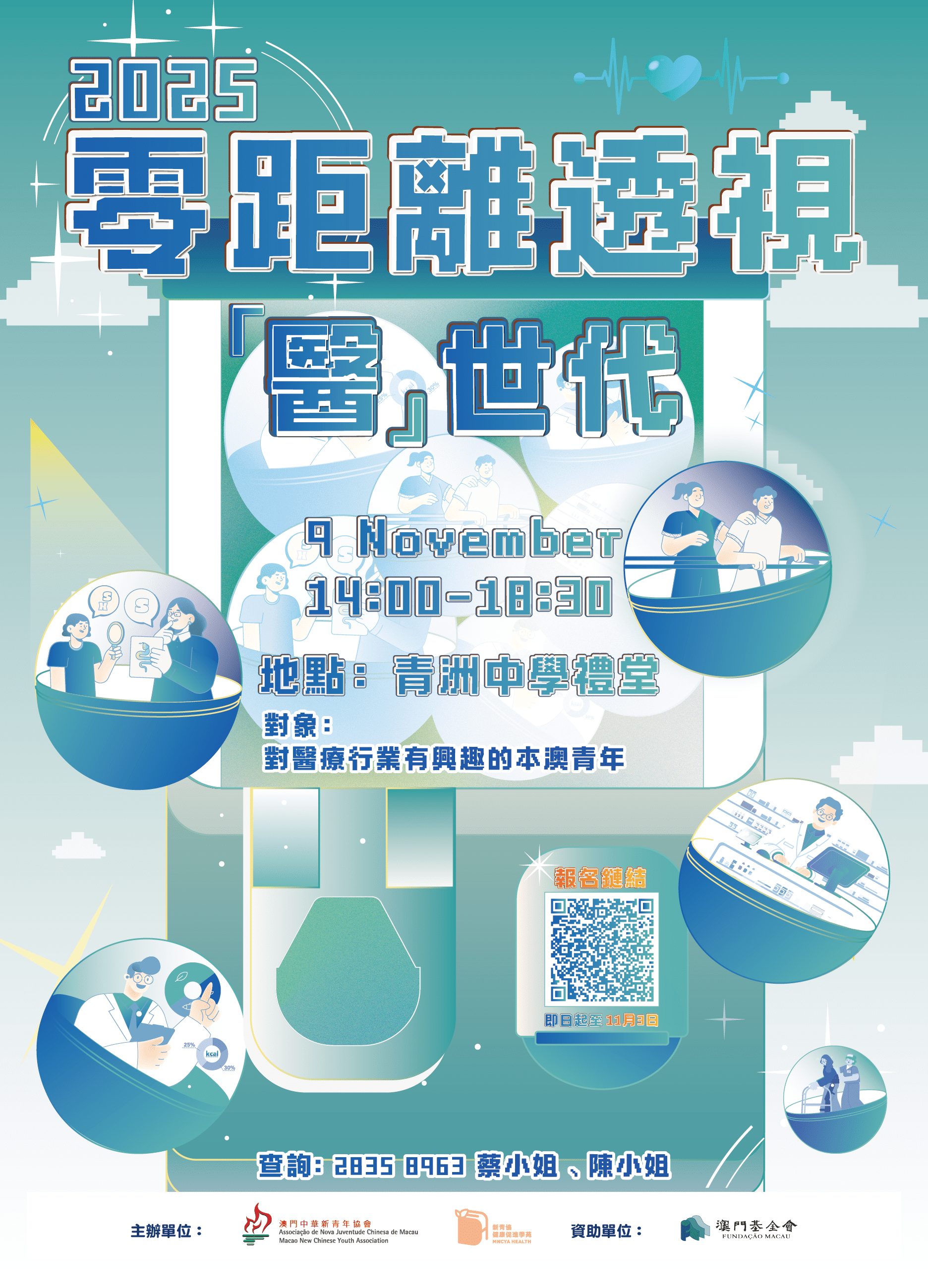 活動將邀請本澳十五類的專業醫護人員親身分享升讀和從事醫護工作的經驗,讓有志投身醫學界的青年可以對各醫療人員專業資格和醫療行業的就業前景作多方面了解,提升參加者的競爭力,支持青年更好地規劃未來的生涯發展。