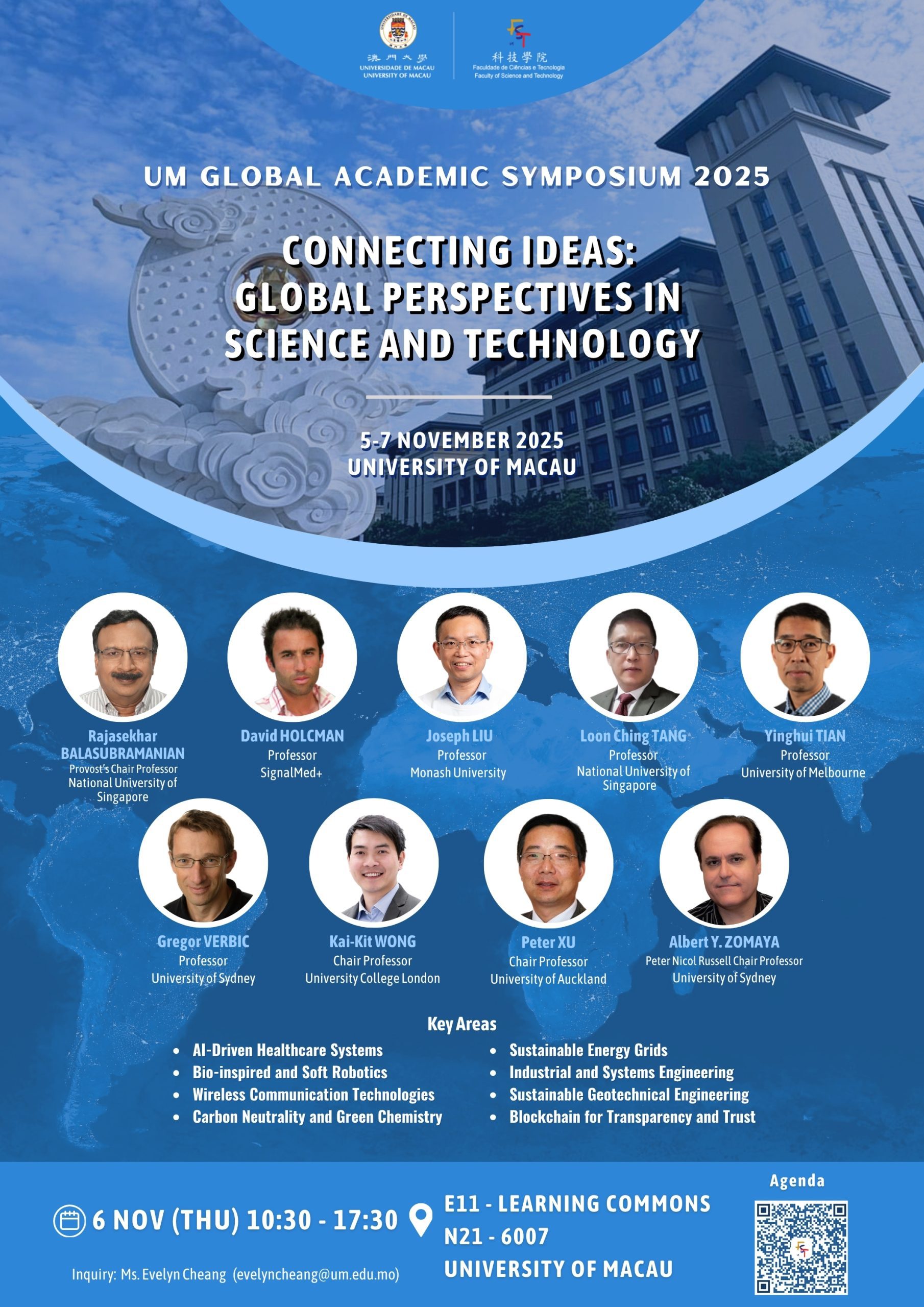 University of Macau (UM) and Faculty of Science and Technology (FST) will hold the UM Global Academic Symposium on 6th November 2025 (Thursday). FST is proud to present the sub-theme “Connecting Ideas – Global Perspectives in Science and Technology,” which aims to foster international collaboration and innovative thinking across various scientific disciplines.