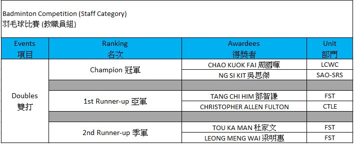【澳大體育節】最新消息 (11): 羽毛球比賽 (教職員組,10月15日) 獲獎名單