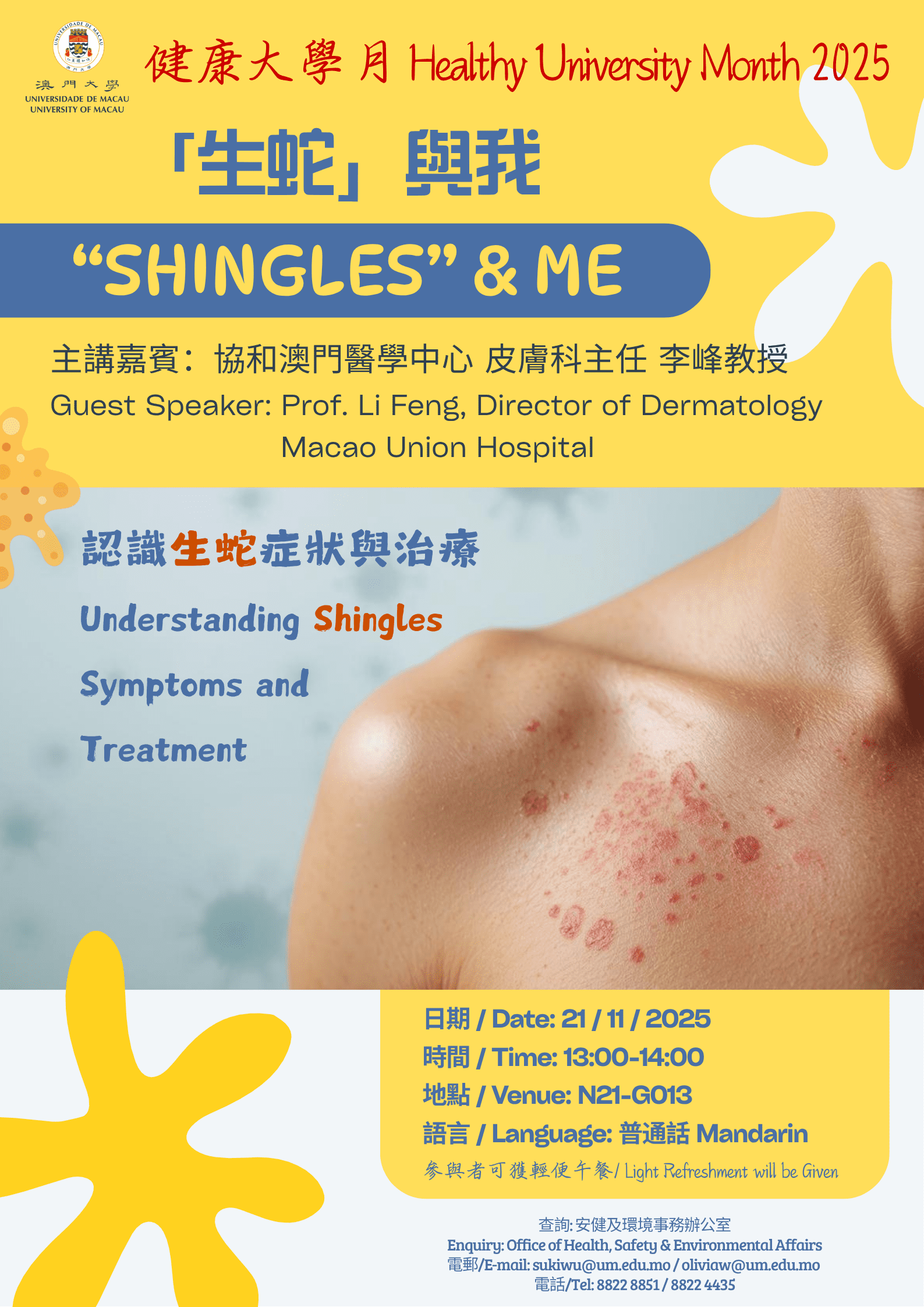 Shingles, also known as herpes zoster, is a viral infection with symptoms typically include a painful, tingling sensation or burning feeling on one side of the body or face, and often followed by a rash of blisters. Knowing about shingles is important to recognize symptoms early, seek prompt treatment, and reduce complications like long-lasting nerve pain. Awareness can improve health outcomes and prevent the spread or severity of the infection. Hence, the Office of Health, Safety and Environmental Affairs has invited Macao Union Hospital to hold a seminar on “Shingles and Me”, with details below: