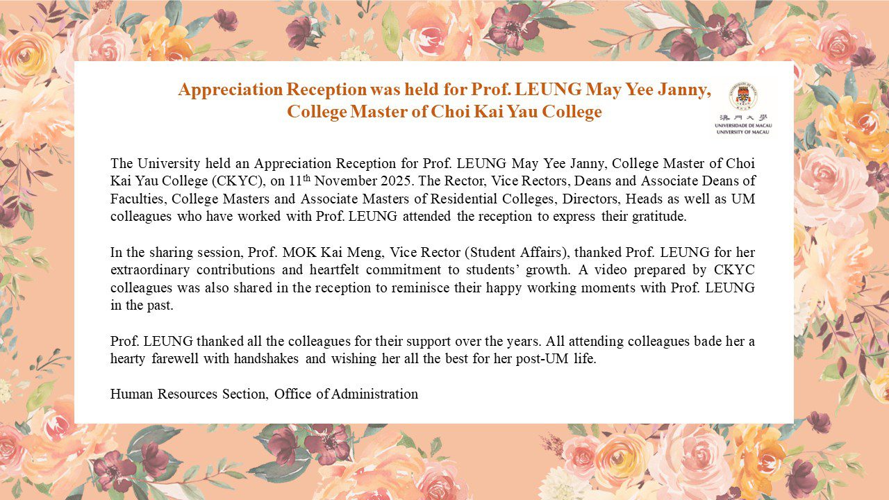Appreciation Reception was held for Prof. LEUNG May Yee Janny, College Master of Choi Kai Yau College