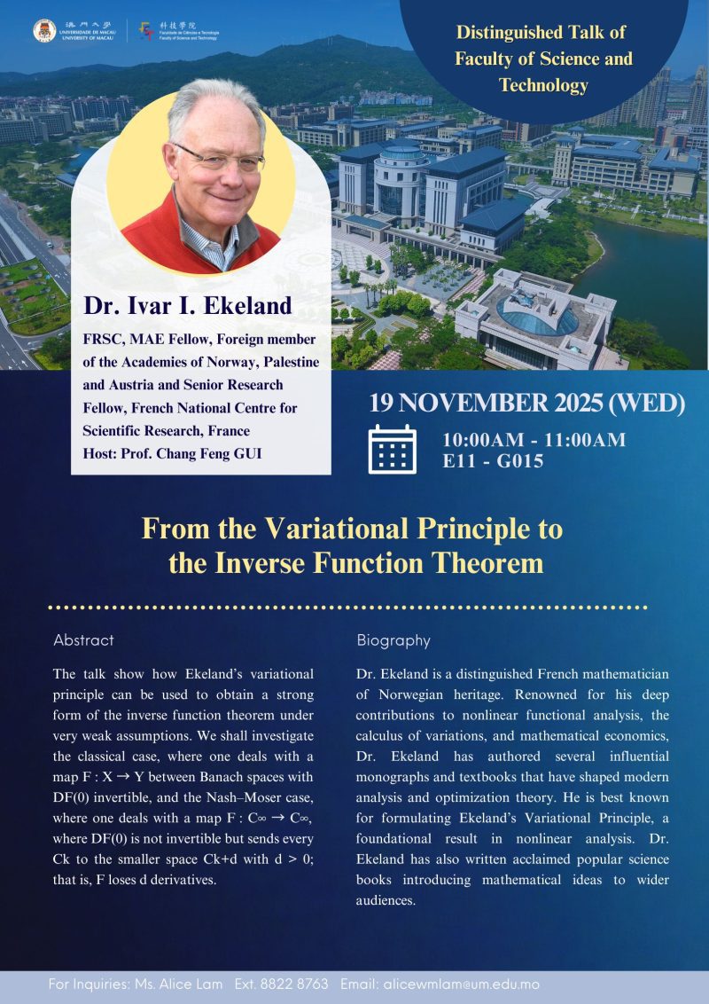 We are pleased to invite you to an upcoming Distinguished Talk organized by the Faculty of Science and Technology on 19 November 2025 (Next Wednesday). This session will feature Dr. Ivar I. Ekeland, Senior Research Fellow at the French National Centre for Scientific Research, who will present cutting-edge research on variational principles and inverse function theorems.