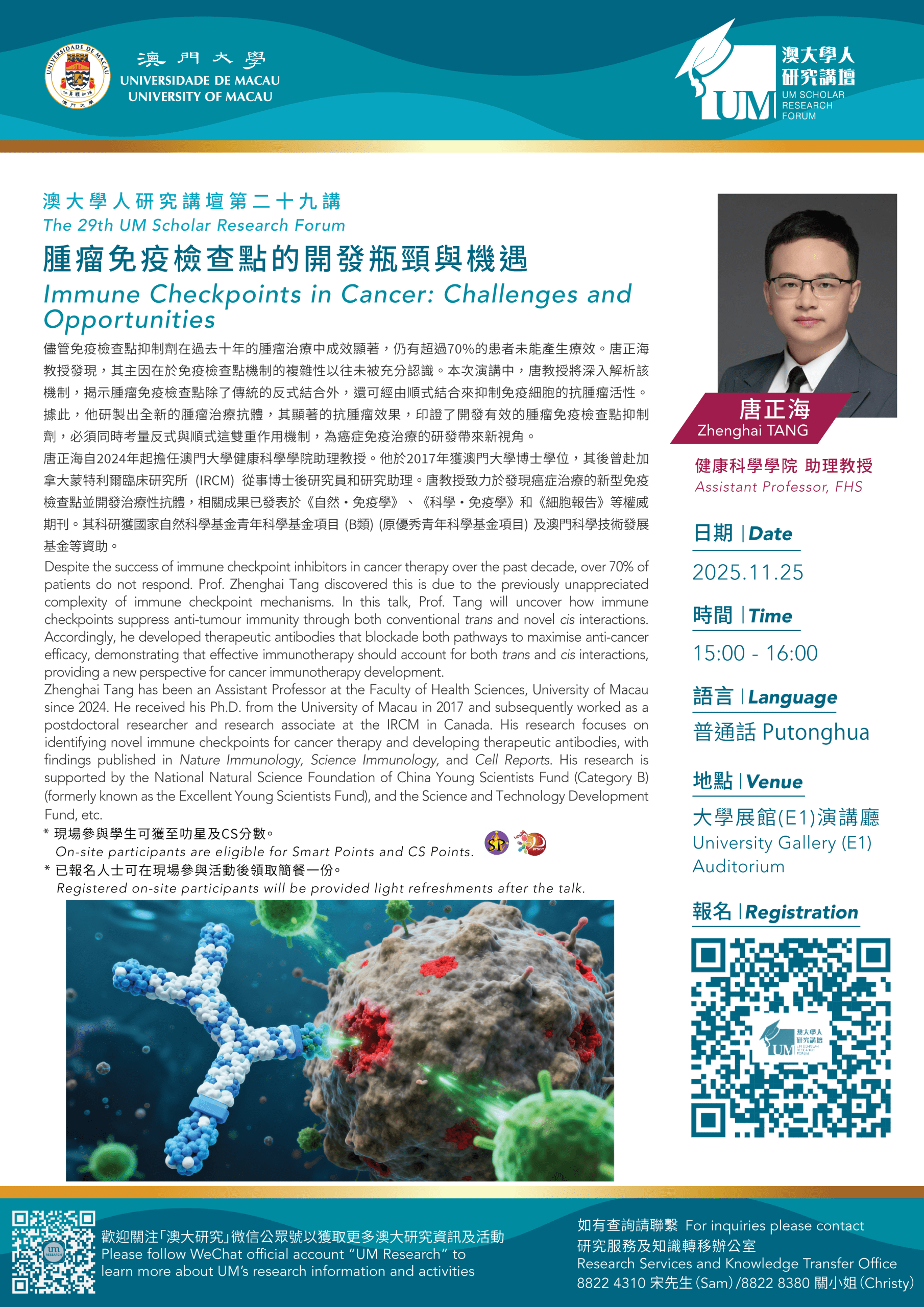 澳大學人研究講壇第二十九講:腫瘤免疫檢查點的開發瓶頸與機遇 [簡餐一份 & 0.5粒至叻星 & 10個CS分數]