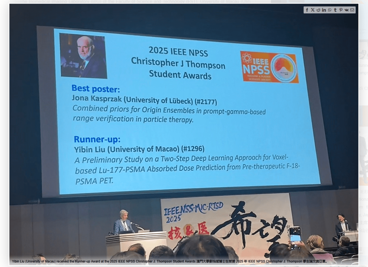 The Biomedical Imaging Laboratory (BIG) of the Faculty of Science and Technology (FST), University of Macau (UM), achieved outstanding results at the 2025 IEEE Nuclear Science Symposium and Medical Imaging Conference (IEEE NSS/MIC) held in Yokohama, Japan. The team had five papers accepted by the conference. Among them, PhD student Yibin Liu was selected as the Runner-up for the IEEE NPSS Christopher J. Thompson Student Paper Awards with his work, entitled “A Preliminary Study on a Two-Step Deep Learning Approach for Voxel-based Lu-177-PSMA Absorbed Dose Prediction from Pre-therapeutic F-18-PSMA PET.”