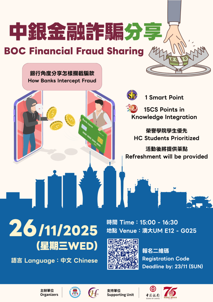 We are excited to announce an upcoming event co-organized by the University of Macau Alumni Association (AAAUM) and the Honours College Student Association (HCSA), supported by the Bank of China (BOC) Macau Branch. A guest speaker from BOC will provide valuable insights on financial fraud, highlighting how the banking industry works to intercept fraud and reduce everyday cases in Macao. Staying informed on this important topic is essential for everyone.