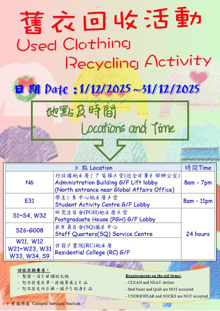 校園服務處於2025年12月1日至12月31日在校園舉辦舊衣回收活動,歡迎各位踴躍參加!本處會把收集到的舊衣送到救世軍,再轉交予有需要人士,請多多支持這項有意義又環保的活動!