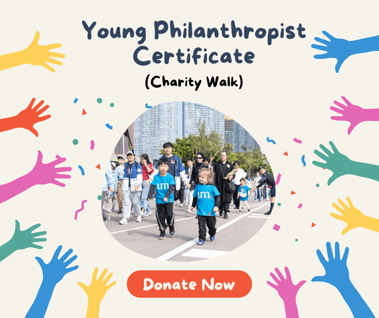 To encourage children to participate in charitable activities from a young age, participants aged 12 or below will receive a specially designed ‘Young Philanthropist’ certificate and a UM children’s T-shirt.
