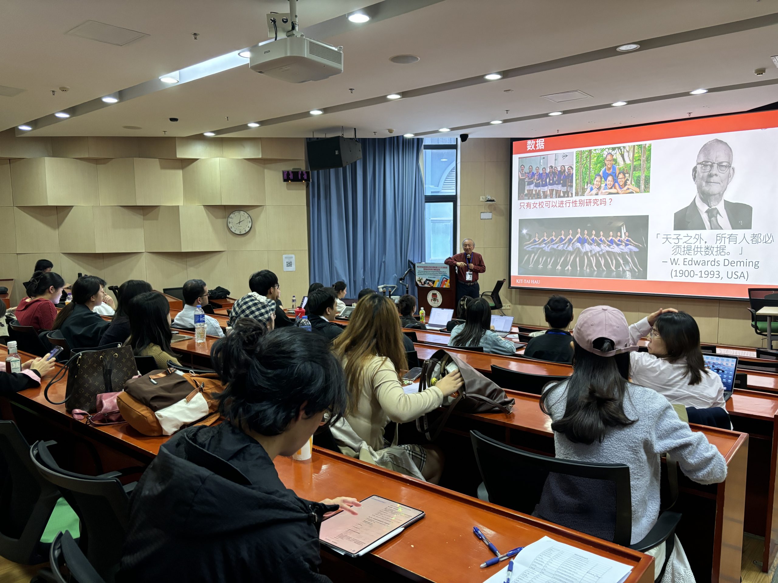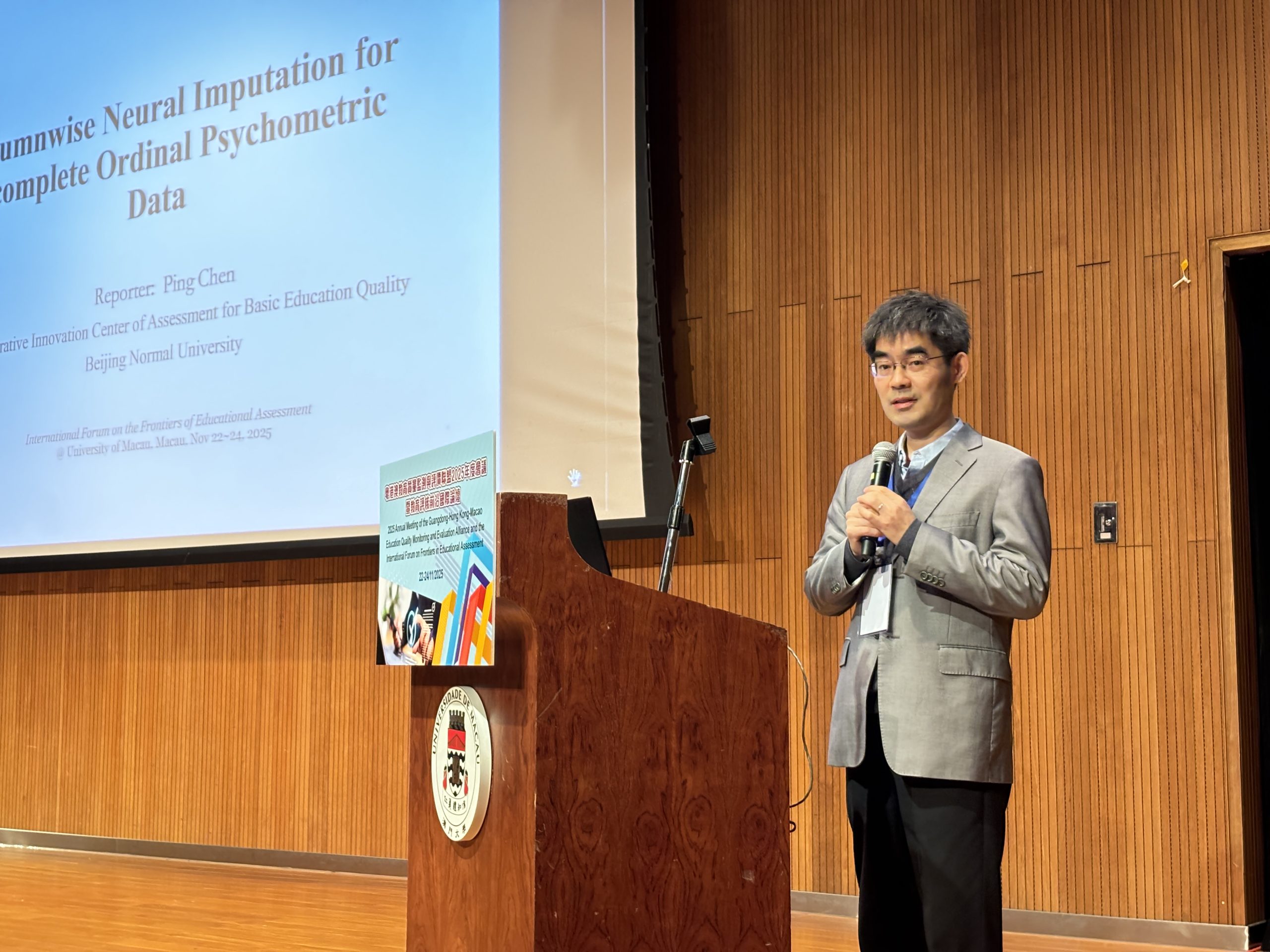 此外,北京師範大學辛濤教授闡述 “學評融合” 理念從選拔導向轉向促進學習的實踐轉變;陳平教授介紹COLumnwise神經插補(COLNI)算法,用以有效處理心理測量數據中的順序缺失值。香港中文大學趙建豐教授探討人工智能在自動化評分與複雜能力測量中的角色,強調未來評量將由教師、學生與人工智能協同運作。澳門大學呂偉聰教授講解正則化方法在差異試題功能檢測及試題反應理論中的應用;沙樂樂教授則以法律寫作與學習分析為例,展示人工智能在即時學習回饋中的顯著成效。