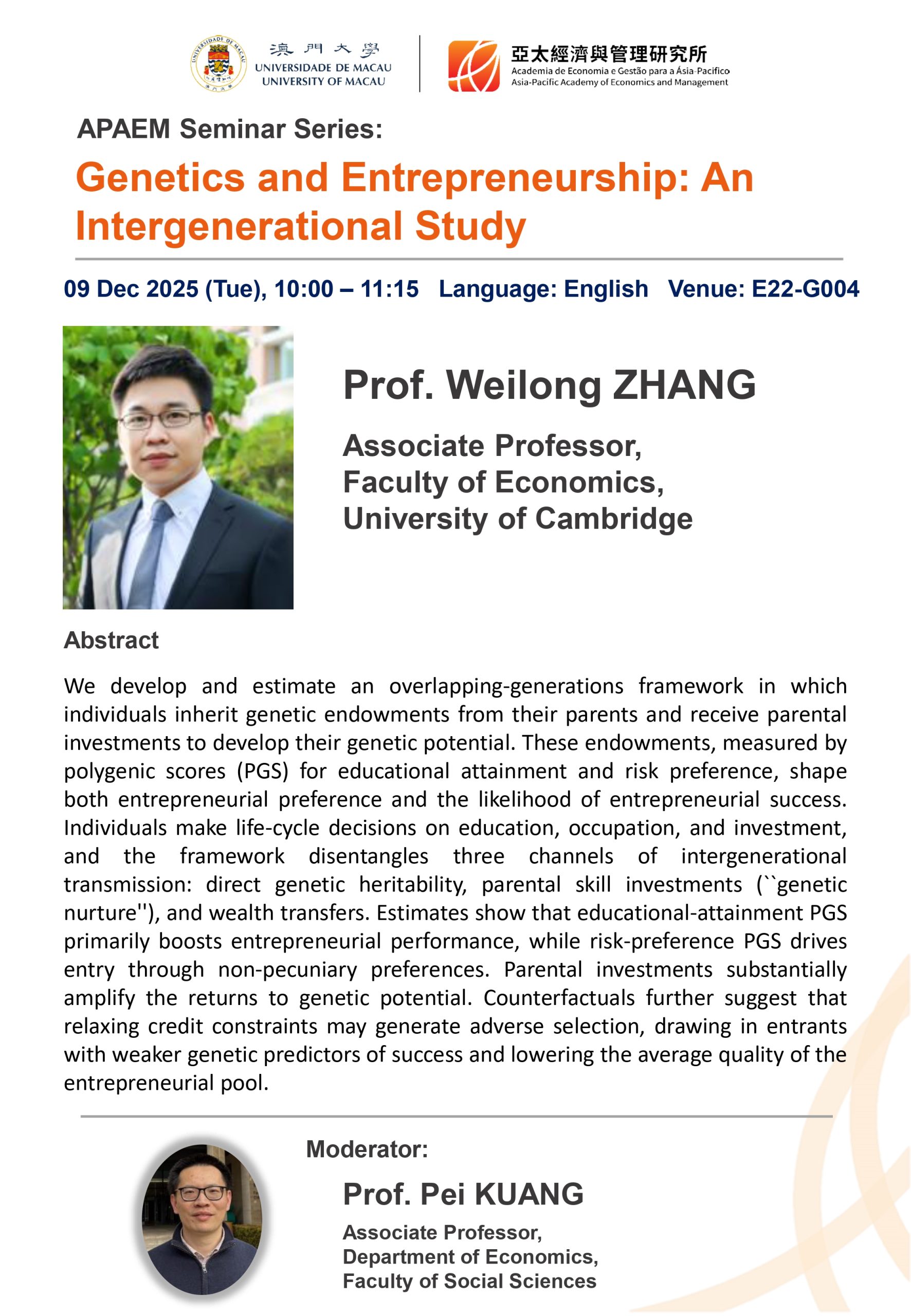 APAEM would like to invite you to our latest seminar “Genetics and Entrepreneurship: An Intergenerational Study” on Dec 09 (Tue), 2025 with the following details: