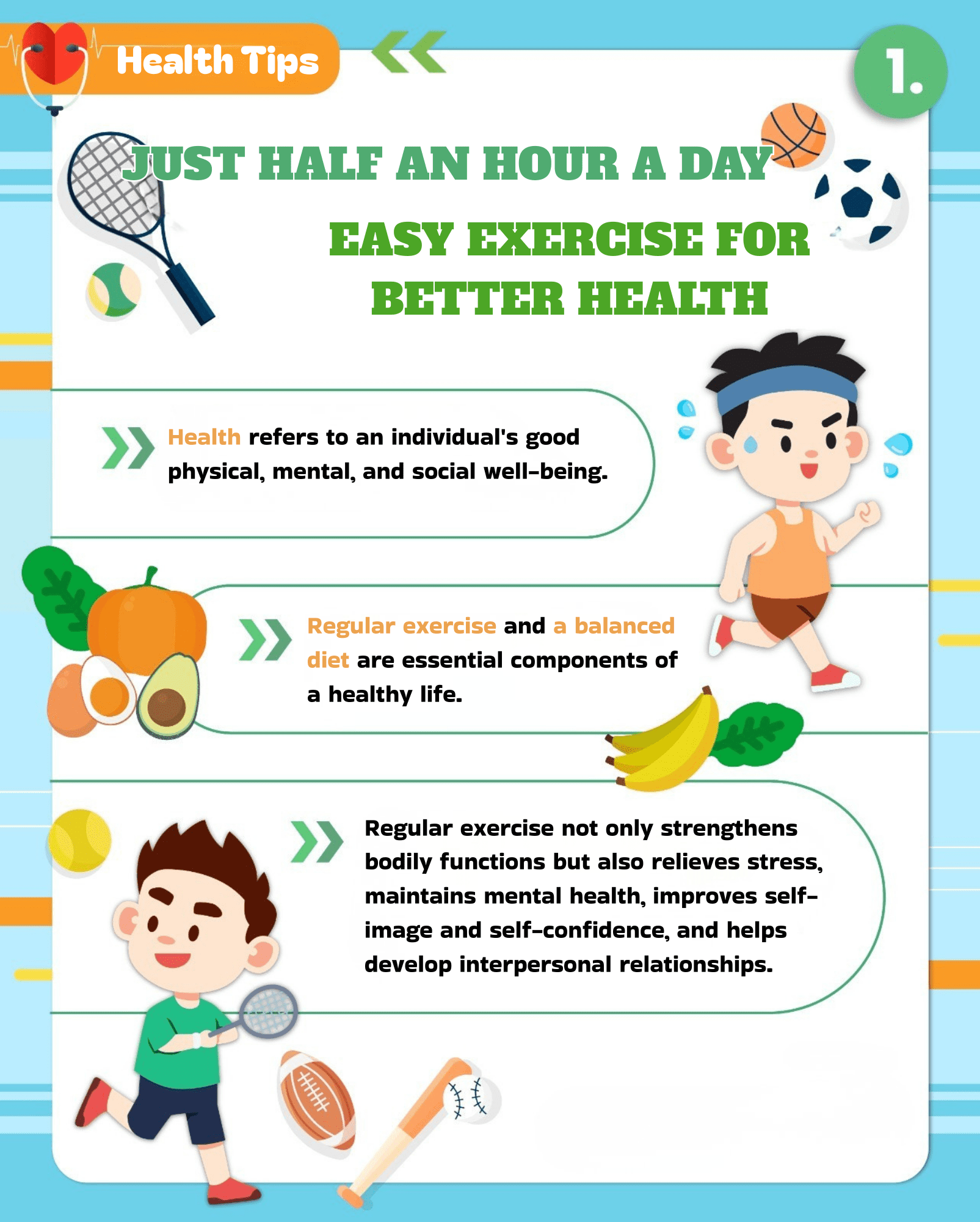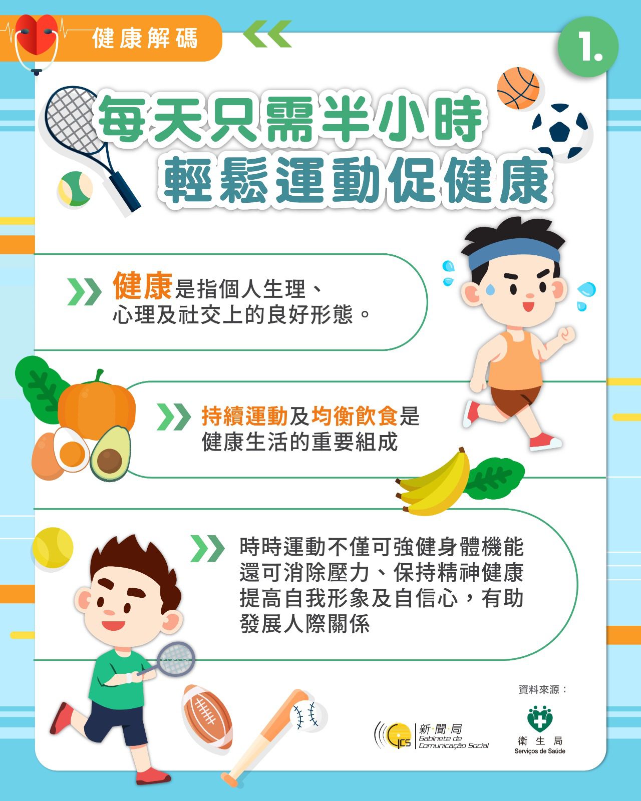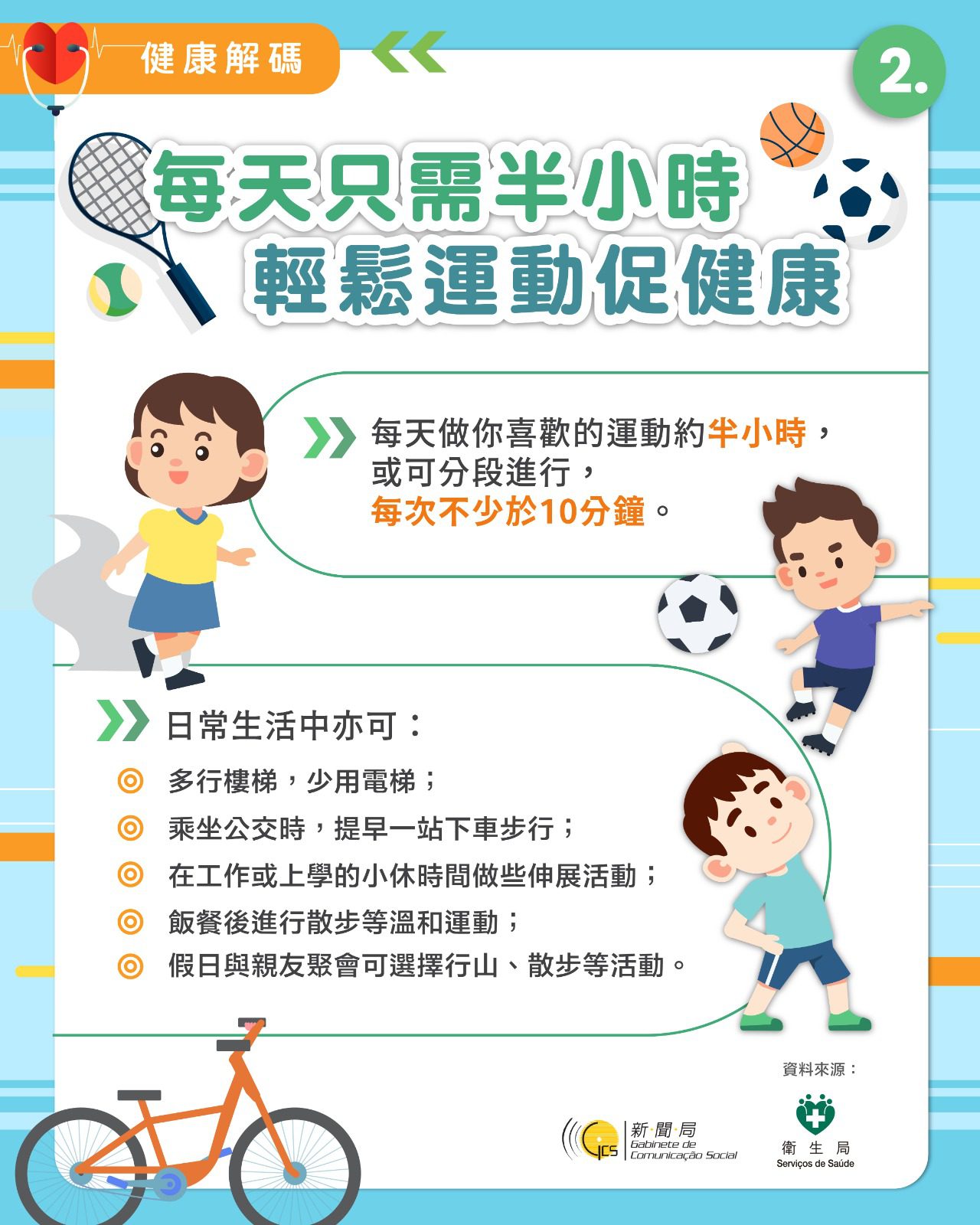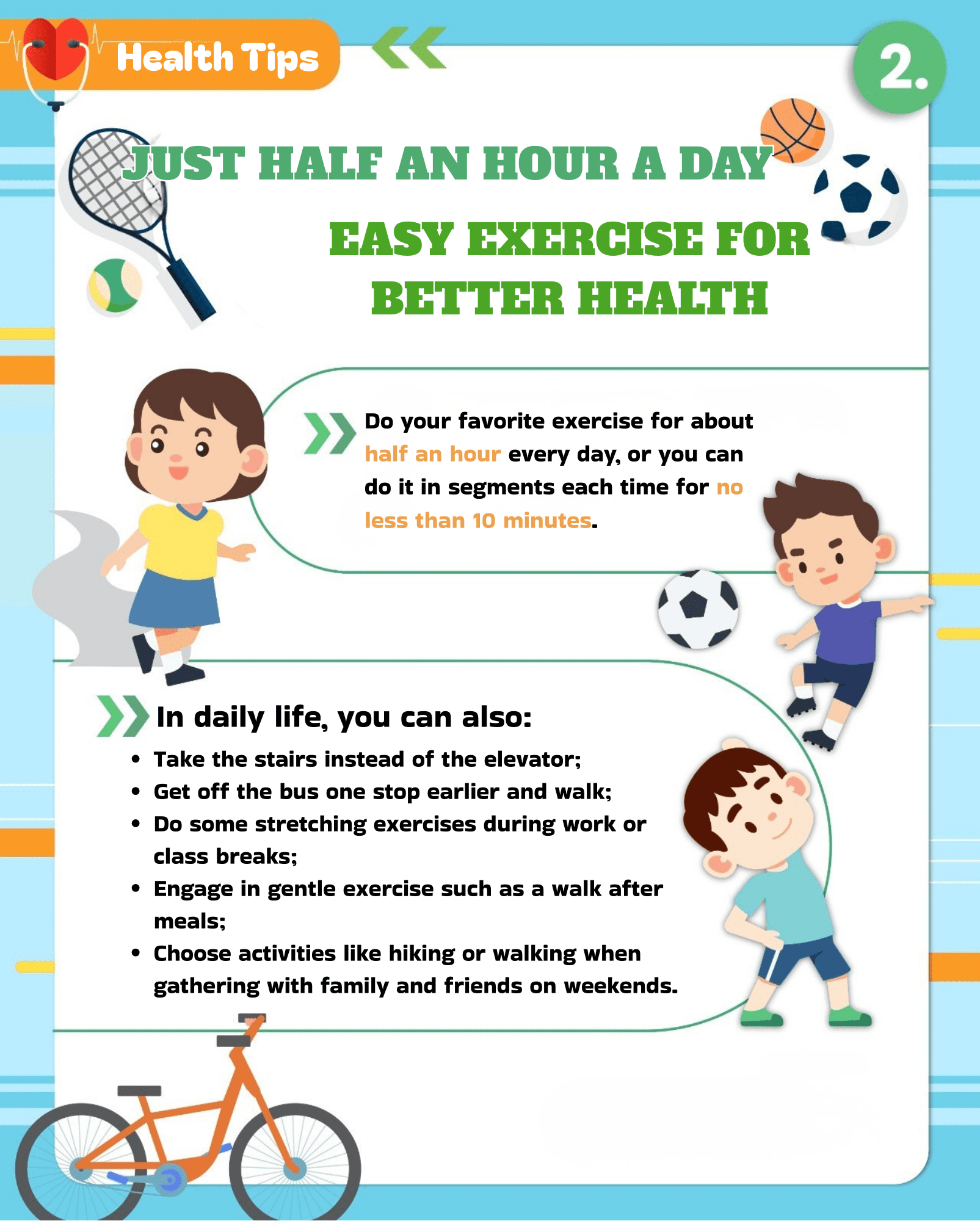 規律運動能帶來短期及長期益處,它能改善身體健康,並透過提升情緒、減輕壓力和焦慮來增強心理健康。以下是衛生局提供有關規律運動的一些健康小貼士,以供參閱。