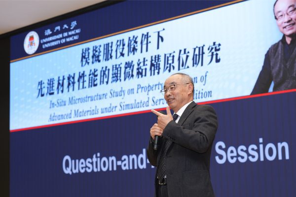 The University of Macau (UM) held a UM Doctor honoris causa Lecture today (28 November). Ze Zhang, recipient of the Doctor of Science honoris causa from UM and a leading scholar in crystal structure in materials science, delivered a talk titled ‘In-Situ Microstructure Study on Property Variation of Advanced Materials under Simulated Service Condition’, where he shared his research findings on the unique microstructures of quasicrystals and other functional nanomaterials, as well as their potential applications.
