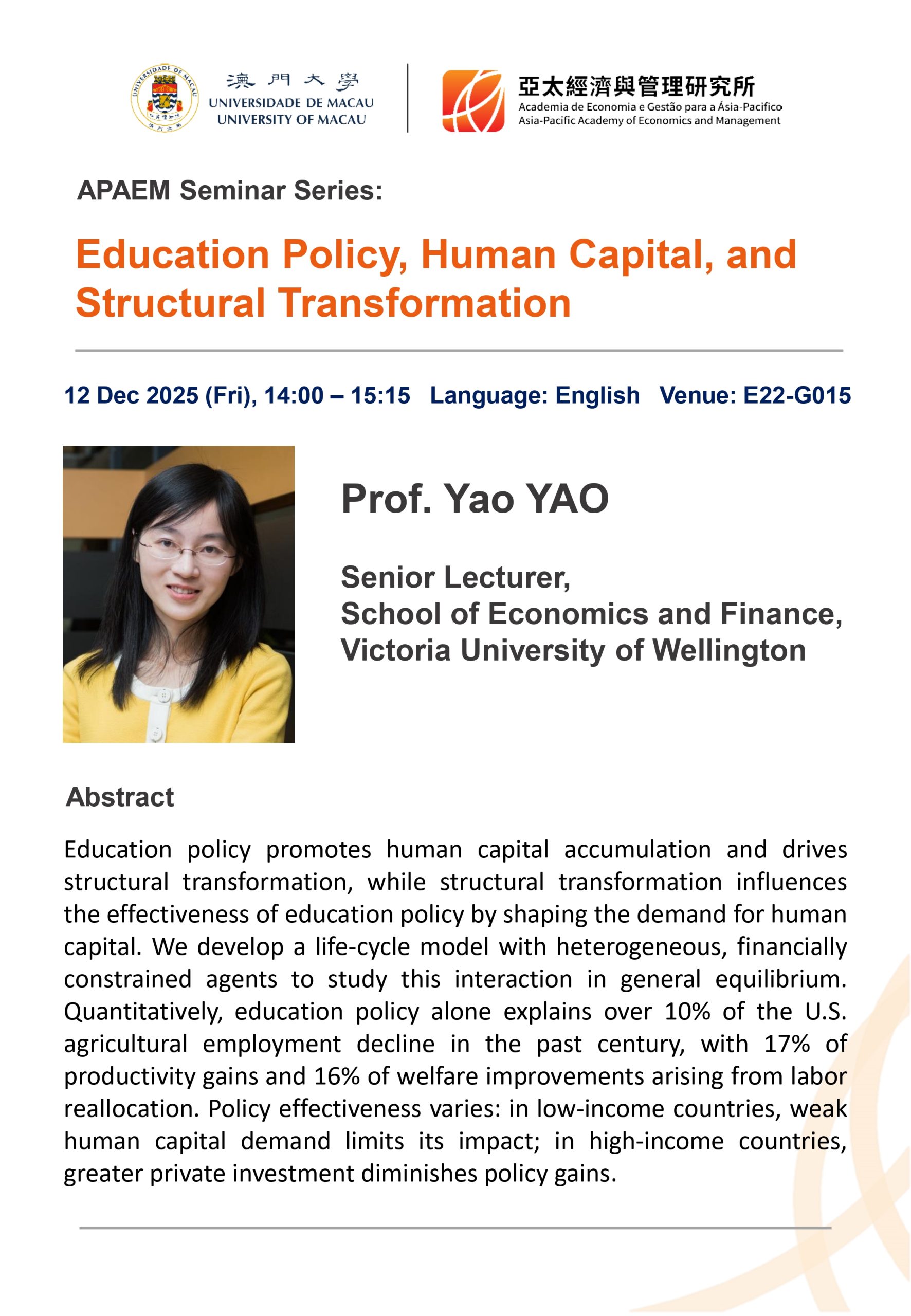 APAEM would like to invite you to our latest seminar “Education Policy, Human Capital, and Structural Transformation” on Dec 12 (Fri), 2025 with the following details: