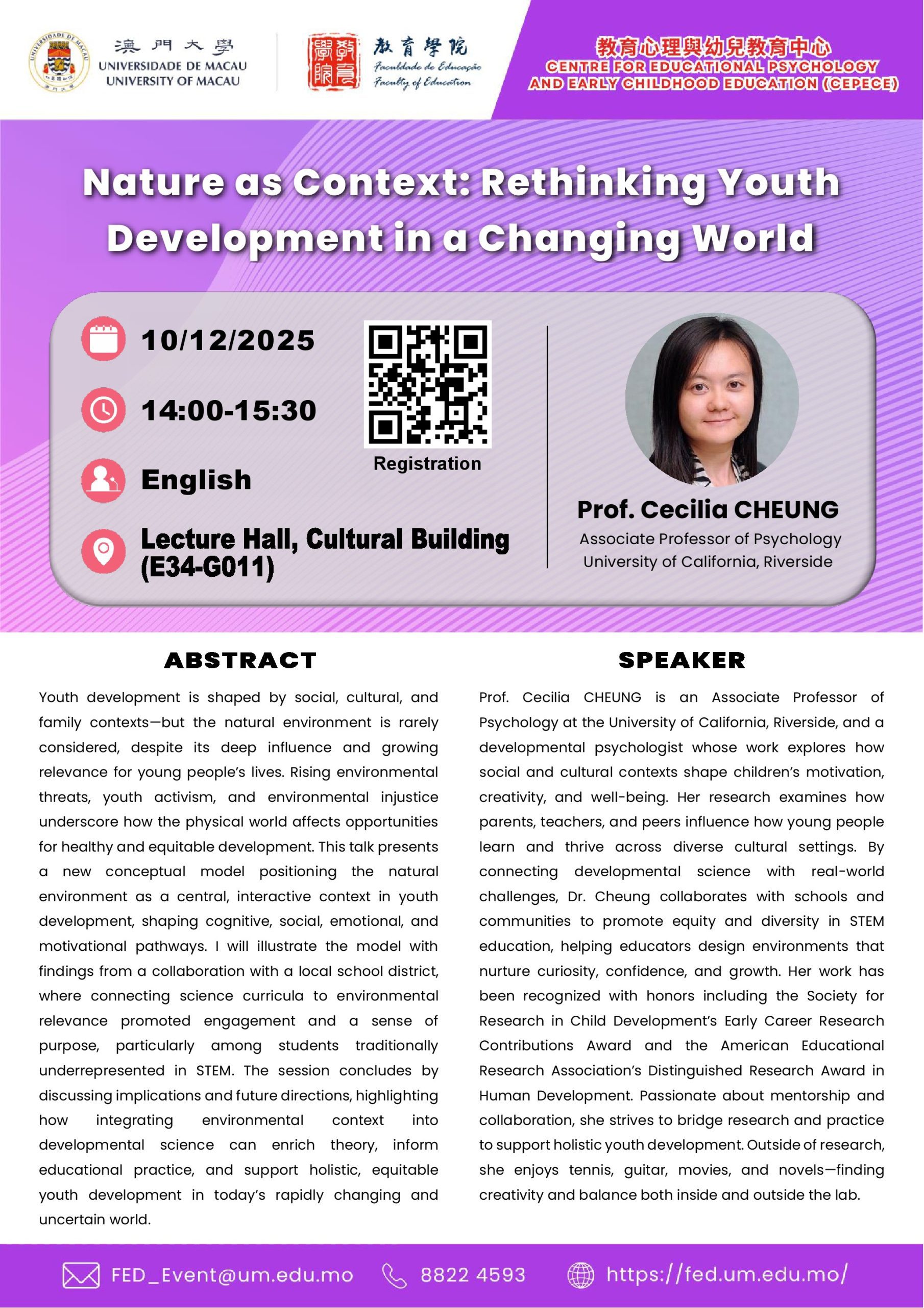 教育學院—教育心理與幼兒教育中心講座:“以自然為脈絡:在變動世界中重新思考青少年發展”